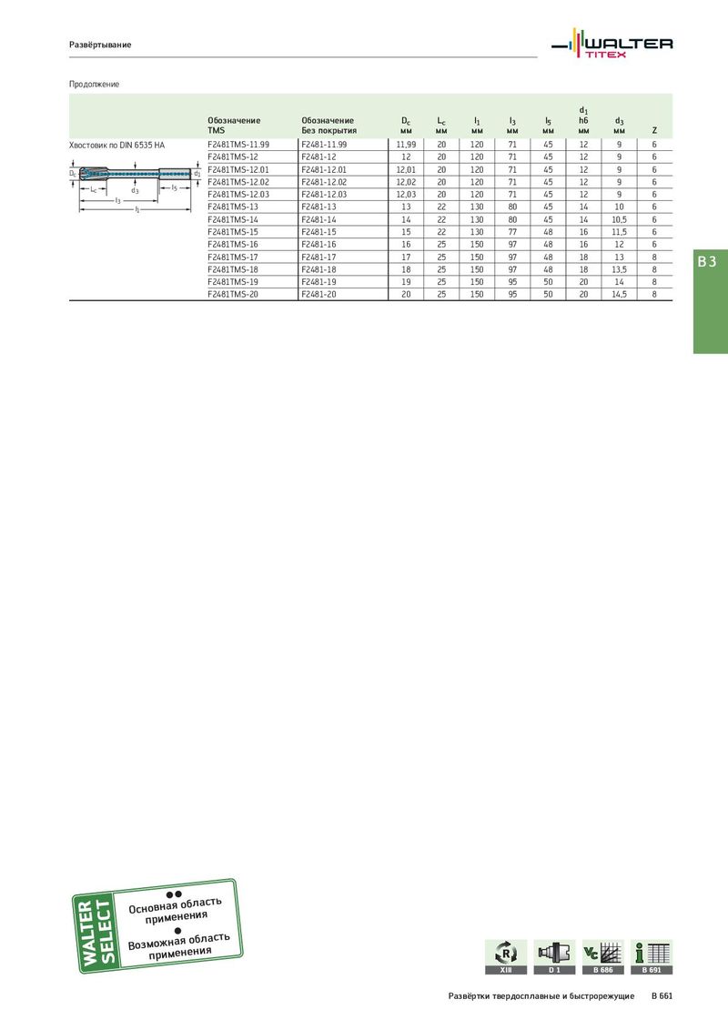 Развёртывание Продолжение d1 Обозначение Обозначение Dc Lc l1 l3 l5 h6 d3 TMS Без покрытия мм мм мм мм мм мм мм Z Хвостовик по DIN 6535 HA F2481TMS-11.99 F2481-11.99 11,99 20 120 71 45 12 9 6 F2481TMS-12 F2481-12 12 20 120 71 45 12 9 6 Dc d1 F2481TMS-12.01 F2481-12.01 12,01 20 120 71 45 12 9 6 Lc l5 F2481TMS-12.02 F2481-12.02 12,02 20 120 71 45 12 9 6 d3 F2481TMS-12.03 F2481-12.03 12,03 20 120 71 45 12 9 6 l3 F2481TMS-13 F2481-13 13 22 130 80 45 14 10 6 l1 F2481TMS-14 F2481-14 14 22 130 80 45 14 10,5 6 F2481TMS-15 F2481-15 15 22 130 77 48 16 11,5 6 F2481TMS-16 F2481-16 16 25 150 97 48 16 12 6 F2481TMS-17 F2481-17 17 25 150 97 48 18 13 8 B3 F2481TMS-18 F2481-18 18 25 150 97 48 18 13,5 8 F2481TMS-19 F2481-19 19 25 150 95 50 20 14 8 F2481TMS-20 F2481-20 20 25 150 95 50 20 14,5 8 Оснпорвинмаеяноебнлиаясть Возмпоржимнаеянеонбиляасть XIII D1 B 686 B 691 Развёртки твердосплавные и быстрорежущие B 661