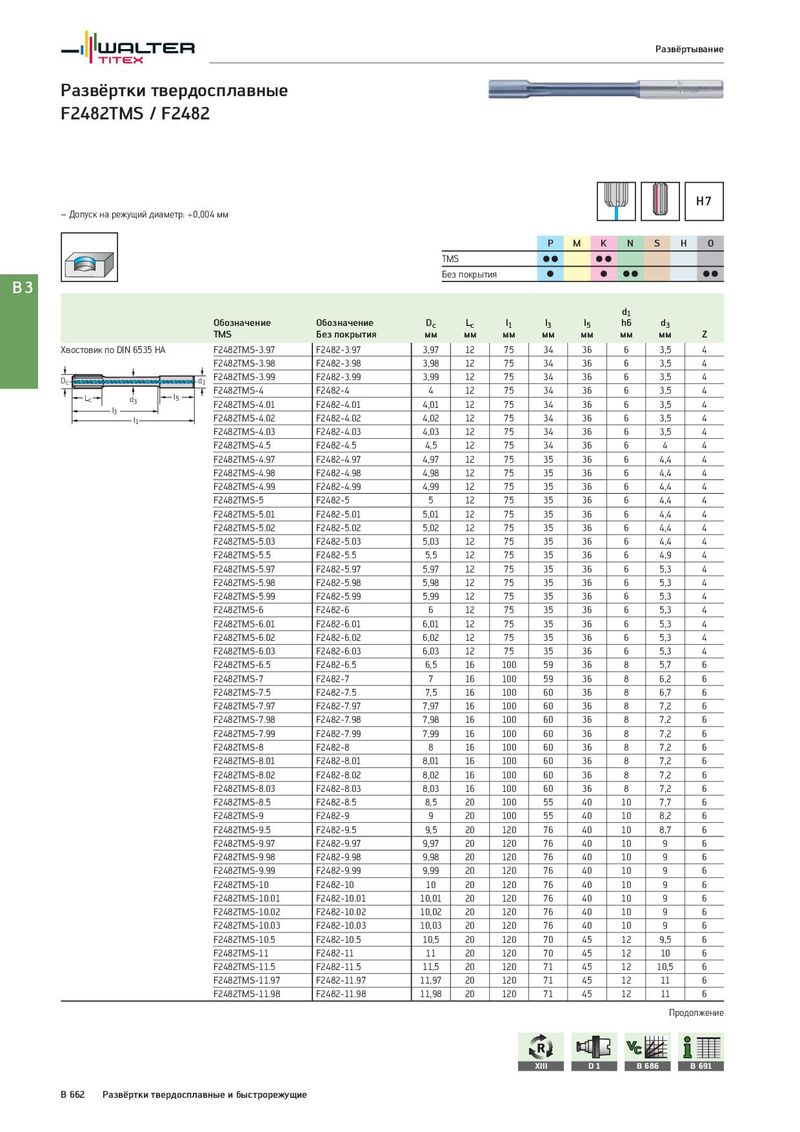 Развёртывание Развёртки твердосплавные F2482TMS / F2482 H7 – Допуск на режущий диаметр: +0,004 мм P M K N S H O TMS CC CC Без покрытия C C CC CC B3 d1 Обозначение Обозначение Dc Lc l1 l3 l5 h6 d3 TMS Без покрытия мм мм мм мм мм мм мм Z Хвостовик по DIN 6535 HA F2482TMS-3.97 F2482-3.97 3,97 12 75 34 36 6 3,5 4 F2482TMS-3.98 F2482-3.98 3,98 12 75 34 36 6 3,5 4 Dc d1 F2482TMS-3.99 F2482-3.99 3,99 12 75 34 36 6 3,5 4 Lc l5 F2482TMS-4 F2482-4 4 12 75 34 36 6 3,5 4 d3 F2482TMS-4.01 F2482-4.01 4,01 12 75 34 36 6 3,5 4 l3 F2482TMS-4.02 F2482-4.02 4,02 12 75 34 36 6 3,5 4 l1 F2482TMS-4.03 F2482-4.03 4,03 12 75 34 36 6 3,5 4 F2482TMS-4.5 F2482-4.5 4,5 12 75 34 36 6 4 4 F2482TMS-4.97 F2482-4.97 4,97 12 75 35 36 6 4,4 4 F2482TMS-4.98 F2482-4.98 4,98 12 75 35 36 6 4,4 4 F2482TMS-4.99 F2482-4.99 4,99 12 75 35 36 6 4,4 4 F2482TMS-5 F2482-5 5 12 75 35 36 6 4,4 4 F2482TMS-5.01 F2482-5.01 5,01 12 75 35 36 6 4,4 4 F2482TMS-5.02 F2482-5.02 5,02 12 75 35 36 6 4,4 4 F2482TMS-5.03 F2482-5.03 5,03 12 75 35 36 6 4,4 4 F2482TMS-5.5 F2482-5.5 5,5 12 75 35 36 6 4,9 4 F2482TMS-5.97 F2482-5.97 5,97 12 75 35 36 6 5,3 4 F2482TMS-5.98 F2482-5.98 5,98 12 75 35 36 6 5,3 4 F2482TMS-5.99 F2482-5.99 5,99 12 75 35 36 6 5,3 4 F2482TMS-6 F2482-6 6 12 75 35 36 6 5,3 4 F2482TMS-6.01 F2482-6.01 6,01 12 75 35 36 6 5,3 4 F2482TMS-6.02 F2482-6.02 6,02 12 75 35 36 6 5,3 4 F2482TMS-6.03 F2482-6.03 6,03 12 75 35 36 6 5,3 4 F2482TMS-6.5 F2482-6.5 6,5 16 100 59 36 8 5,7 6 F2482TMS-7 F2482-7 7 16 100 59 36 8 6,2 6 F2482TMS-7.5 F2482-7.5 7,5 16 100 60 36 8 6,7 6 F2482TMS-7.97 F2482-7.97 7,97 16 100 60 36 8 7,2 6 F2482TMS-7.98 F2482-7.98 7,98 16 100 60 36 8 7,2 6 F2482TMS-7.99 F2482-7.99 7,99 16 100 60 36 8 7,2 6 F2482TMS-8 F2482-8 8 16 100 60 36 8 7,2 6 F2482TMS-8.01 F2482-8.01 8,01 16 100 60 36 8 7,2 6 F2482TMS-8.02 F2482-8.02 8,02 16 100 60 36 8 7,2 6 F2482TMS-8.03 F2482-8.03 8,03 16 100 60 36 8 7,2 6 F2482TMS-8.5 F2482-8.5 8,5 20 100 55 40 10 7,7 6 F2482TMS-9 F2482-9 9 20 100 55 40 10 8,2 6 F2482TMS-9.5 F2482-9.5 9,5 20 120 76 40 10 8,7 6 F2482TMS-9.97 F2482-9.97 9,97 20 120 76 40 10 9 6 F2482TMS-9.98 F2482-9.98 9,98 20 120 76 40 10 9 6 F2482TMS-9.99 F2482-9.99 9,99 20 120 76 40 10 9 6 F2482TMS-10 F2482-10 10 20 120 76 40 10 9 6 F2482TMS-10.01 F2482-10.01 10,01 20 120 76 40 10 9 6 F2482TMS-10.02 F2482-10.02 10,02 20 120 76 40 10 9 6 F2482TMS-10.03 F2482-10.03 10,03 20 120 76 40 10 9 6 F2482TMS-10.5 F2482-10.5 10,5 20 120 70 45 12 9,5 6 F2482TMS-11 F2482-11 11 20 120 70 45 12 10 6 F2482TMS-11.5 F2482-11.5 11,5 20 120 71 45 12 10,5 6 F2482TMS-11.97 F2482-11.97 11,97 20 120 71 45 12 11 6 F2482TMS-11.98 F2482-11.98 11,98 20 120 71 45 12 11 6 Продолжение XIII D 1 B 686 B 691 B 662 Развёртки твердосплавные и быстрорежущие