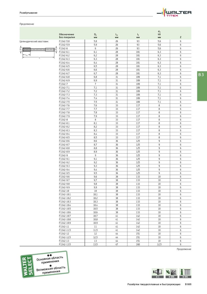 Развёртывание Продолжение d1 Обозначение Dc Lc l1 h9 Без покрытия мм мм мм мм Z Цилиндрический хвостовик F1342-5.8 5,8 26 93 5,6 6 F1342-5.9 5,9 26 93 5,6 6 Dc d1 F1342-6 6 26 93 5,6 6 F1342-6.1 6,1 28 101 6,3 6 Lc F1342-6.2 6,2 28 101 6,3 6 l1 F1342-6.3 6,3 28 101 6,3 6 F1342-6.4 6,4 28 101 6,3 6 F1342-6.5 6,5 28 101 6,3 6 F1342-6.6 6,6 28 101 6,3 6 F1342-6.7 6,7 28 101 6,3 6 B3 F1342-6.8 6,8 31 109 7,1 6 F1342-6.9 6,9 31 109 7,1 6 F1342-7 7 31 109 7,1 6 F1342-7.1 7,1 31 109 7,1 6 F1342-7.2 7,2 31 109 7,1 6 F1342-7.3 7,3 31 109 7,1 6 F1342-7.4 7,4 31 109 7,1 6 F1342-7.5 7,5 31 109 7,1 6 F1342-7.6 7,6 33 117 8 6 F1342-7.7 7,7 33 117 8 6 F1342-7.8 7,8 33 117 8 6 F1342-7.9 7,9 33 117 8 6 F1342-8 8 33 117 8 6 F1342-8.1 8,1 33 117 8 6 F1342-8.2 8,2 33 117 8 6 F1342-8.3 8,3 33 117 8 6 F1342-8.4 8,4 33 117 8 6 F1342-8.5 8,5 33 117 8 6 F1342-8.6 8,6 36 125 9 6 F1342-8.7 8,7 36 125 9 6 F1342-8.8 8,8 36 125 9 6 F1342-8.9 8,9 36 125 9 6 F1342-9 9 36 125 9 6 F1342-9.1 9,1 36 125 9 6 F1342-9.2 9,2 36 125 9 6 F1342-9.3 9,3 36 125 9 6 F1342-9.4 9,4 36 125 9 6 F1342-9.5 9,5 36 125 9 6 F1342-9.6 9,6 38 133 10 6 F1342-9.7 9,7 38 133 10 6 F1342-9.8 9,8 38 133 10 6 F1342-9.9 9,9 38 133 10 6 F1342-10 10 38 133 10 6 F1342-10.1 10,1 38 133 10 6 F1342-10.2 10,2 38 133 10 6 F1342-10.3 10,3 38 133 10 6 F1342-10.4 10,4 38 133 10 6 F1342-10.5 10,5 38 133 10 6 F1342-10.6 10,6 38 133 10 6 F1342-10.7 10,7 41 142 10 6 F1342-10.8 10,8 41 142 10 6 F1342-10.9 10,9 41 142 10 6 F1342-11 11 41 142 10 6 F1342-11.5 11,5 41 142 10 6 F1342-12 12 44 151 10 6 F1342-12.5 12,5 44 151 10 6 F1342-13 13 44 151 10 6 F1342-13.5 13,5 47 160 12,5 6 Продолжение Оснпорвинмаеяноебнлиаясть Возмпоржимнаеянеонбиляасть D1 B 686 B 691 Развёртки твердосплавные и быстрорежущие B 669
