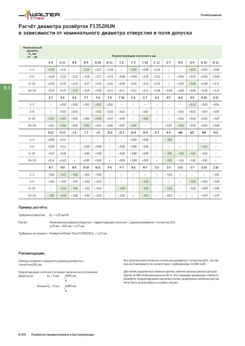Развёртывание Расчёт диаметра развёрток F1352HUN в зависимости от номинального диаметра отверстия и поля допуска Номинальный диаметр Dc мм Корректирующие значения в мм от – до A9 A 11 B8 B9 B 10 B 11 C8 C9 C 10 C 11 D7 D8 D9 D 10 D 11 1–3 + 0,28 + 0,31 – + 0,15 + 0,17 + 0,18 – + 0,07 + 0,09 + 0,10 – – + 0,03 + 0,05 + 0,06 3–6 + 0,29 + 0,32 + 0,15 + 0,16 + 0,17 + 0,19 + 0,08 + 0,09 + 0,10 + 0,12 – + 0,04 + 0,05 + 0,06 + 0,08 6–10 + 0,30 + 0,35 + 0,16 + 0,17 + 0,19 + 0,22 + 0,09 + 0,10 + 0,12 + 0,15 – + 0,05 + 0,06 + 0,08 + 0,11 B3 10–18 + 0,32 + 0,37 + 0,16 + 0,18 + 0,20 + 0,23 + 0,11 + 0,12 + 0,14 + 0,18 + 0,06 + 0,06 + 0,08 + 0,10 + 0,13 E7 E8 E9 F7 F8 F9 F 10 G6 G7 H6 H7 H8 H9 H 10 H 11 1–3 – + 0,02 + 0,03 + 0,01 + 0,01 + 0,02 – – – – – – + 0,01 + 0,03 + 0,04 3–6 – + 0,03 + 0,04 – + 0,02 + 0,03 + 0,04 – + 0,01 – – + 0,01 + 0,02 + 0,03 + 0,05 6–10 + 0,03 + 0,03 + 0,05 + 0,02 + 0,02 + 0,03 + 0,05 – + 0,01 – – + 0,01 + 0,02 + 0,04 + 0,07 10–18 + 0,04 + 0,04 + 0,06 + 0,02 + 0,03 + 0,04 + 0,07 + 0,01 – – + 0,01 + 0,01 + 0,03 + 0,05 + 0,08 H 12 H 13 J6 J7 J8 JS 6 JS 7 JS 8 JS 9 K7 K8 M6 M7 M8 N6 1–3 + 0,08 + 0,11 – – – – – + 0,00 + 0,00 – – 0,01 – – – – 3–6 + 0,09 + 0,14 – + 0,00 + 0,00 – + 0,00 + 0,00 + 0,00 – – – – – 0,01 – 6–10 + 0,12 + 0,18 – + 0,00 + 0,00 – + 0,00 + 0,00 + 0,00 – – 0,01 – 0,01 – 0,01 – 0,01 – 10–18 + 0,14 + 0,22 – + 0,00 + 0,00 – + 0,00 + 0,00 + 0,01 – – 0,01 – 0,01 – 0,01 – 0,01 – N7 N8 N9 N 10 N 11 P6 P7 R6 R7 S6 S7 U6 U7 U 10 Z 10 1–3 – 0,01 – 0,01 – 0,02 – 0,02 – 0,02 – – – – – – 0,02 – – – – 0,04 3–6 – 0,01 – 0,01 – 0,01 – 0,02 – 0,02 – – – – 0,02 – – – – 0,03 – 0,04 – 0,05 6–10 – – 0,02 – 0,01 – 0,02 – 0,02 – – 0,02 – – 0,02 – – 0,03 – – 0,03 – 0,05 – 0,06 10–18 – 0,01 – 0,02 – 0,02 – 0,02 – 0,03 – – 0,02 – – 0,03 – – 0,03 – – – 0,05 – 0,07 Пример расчёта: Требуемое отверстие: Dc = 4,25 мм F8 Расчёт: Номинальный диаметр отверстия + корректирующее значение = диаметр развёртки с точностью 0,01 4,25 мм + 0,02 мм = 4,27 мм Требуемые инструмент: Развёртка Walter Titex F1352HUN Dc = 4,27 мм Рекомендации: Таблица позволяет определить диаметр развёртки с Все допуски можно получить, используя развёртки с точностью 0,01, так как точностью 0,01 мм. они изготавливаются в соответствии с требованиями по DIN 1420. Корректирующие значения учитывают допуски на изготовление: Для полей, выделенных зелёным цветом, нижняя граница допуска для раз- Диаметр до Dc = 6 мм 0,004 мм вёрток по DIN 1420 уменьшена на 25 %. Это сокращает размерную стойкость + развёртки. Корректирующие значения в полях, выделенных зелёным цветом, 0 могут быть использованы в особых случаях. больше Dc = 6 мм 0,005 мм + 0 B 674 Развёртки твердосплавные и быстрорежущие
