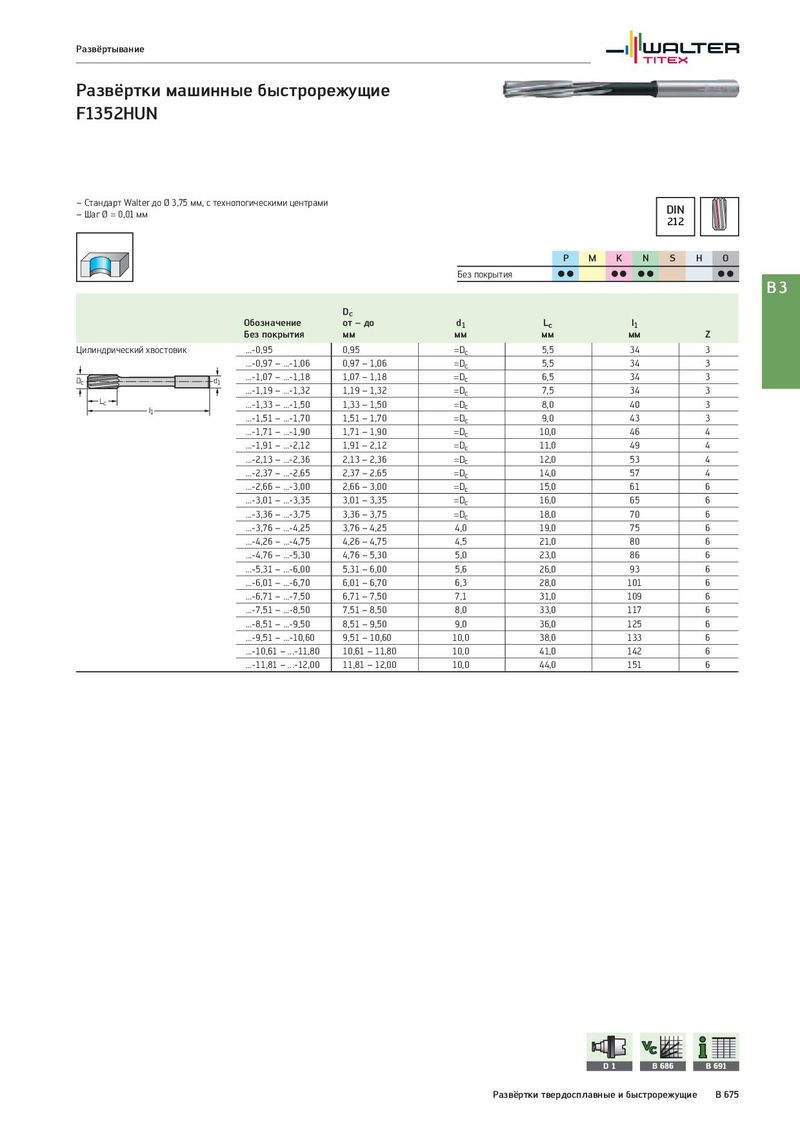 Развёртывание Развёртки машинные быстрорежущие F1352HUN – Стандарт Walter до Ø 3,75 мм, с технологическими центрами DIN – Шаг Ø = 0,01 мм 212 P M K N S H O Без покрытия CC CC CC CC B3 Dc Обозначение от – до d1 Lc l1 Без покрытия мм мм мм мм Z Цилиндрический хвостовик ...-0,95 0,95 =Dc 5,5 34 3 ...-0,97 – ...-1,06 0,97 – 1,06 =Dc 5,5 34 3 Dc d1 ...-1,07 – ...-1,18 1,07 – 1,18 =Dc 6,5 34 3 ...-1,19 – ...-1,32 1,19 – 1,32 =Dc 7,5 34 3 Lc ...-1,33 – ...-1,50 1,33 – 1,50 =Dc 8,0 40 3 l1 ...-1,51 – ...-1,70 1,51 – 1,70 =Dc 9,0 43 3 ...-1,71 – ...-1,90 1,71 – 1,90 =Dc 10,0 46 4 ...-1,91 – ...-2,12 1,91 – 2,12 =Dc 11,0 49 4 ...-2,13 – ...-2,36 2,13 – 2,36 =Dc 12,0 53 4 ...-2,37 – ...-2,65 2,37 – 2,65 =Dc 14,0 57 4 ...-2,66 – ...-3,00 2,66 – 3,00 =Dc 15,0 61 6 ...-3,01 – ...-3,35 3,01 – 3,35 =Dc 16,0 65 6 ...-3,36 – ...-3,75 3,36 – 3,75 =Dc 18,0 70 6 ...-3,76 – ...-4,25 3,76 – 4,25 4,0 19,0 75 6 ...-4,26 – ...-4,75 4,26 – 4,75 4,5 21,0 80 6 ...-4,76 – ...-5,30 4,76 – 5,30 5,0 23,0 86 6 ...-5,31 – ...-6,00 5,31 – 6,00 5,6 26,0 93 6 ...-6,01 – ...-6,70 6,01 – 6,70 6,3 28,0 101 6 ...-6,71 – ...-7,50 6,71 – 7,50 7,1 31,0 109 6 ...-7,51 – ...-8,50 7,51 – 8,50 8,0 33,0 117 6 ...-8,51 – ...-9,50 8,51 – 9,50 9,0 36,0 125 6 ...-9,51 – ...-10,60 9,51 – 10,60 10,0 38,0 133 6 ...-10,61 – ...-11,80 10,61 – 11,80 10,0 41,0 142 6 ...-11,81 – ...-12,00 11,81 – 12,00 10,0 44,0 151 6 D1 B 686 B 691 Развёртки твердосплавные и быстрорежущие B 675