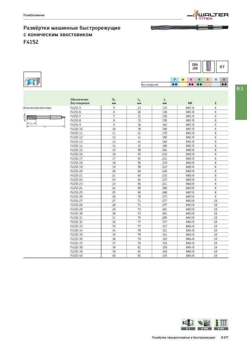 Развёртывание Развёртки машинные быстрорежущие с коническим хвостовиком F4152 DIN H7 208 P M K N S H O Без покрытия CC CC CC CC B3 Обозначение Dc Lc l1 Без покрытия мм мм мм MK Z Конический хвостовик F4152-5 5 23 133 MK1 B 6 F4152-6 6 26 138 MK1 B 6 Dc F4152-7 7 31 150 MK1 B 6 F4152-8 8 33 156 MK1 B 6 Lc F4152-9 9 36 162 MK1 B 6 l1 F4152-10 10 38 168 MK1 B 6 F4152-11 11 41 175 MK1 B 6 F4152-12 12 44 182 MK1 B 6 F4152-13 13 44 182 MK1 B 6 F4152-14 14 47 189 MK1 B 8 F4152-15 15 50 204 MK2 B 8 F4152-16 16 52 210 MK2 B 8 F4152-17 17 54 214 MK2 B 8 F4152-18 18 56 219 MK2 B 8 F4152-19 19 58 223 MK2 B 8 F4152-20 20 60 228 MK2 B 8 F4152-21 21 62 232 MK2 B 8 F4152-22 22 64 237 MK2 B 8 F4152-23 23 66 241 MK2 B 8 F4152-24 24 68 268 MK3 B 8 F4152-25 25 68 268 MK3 B 8 F4152-26 26 70 273 MK3 B 8 F4152-27 27 71 277 MK3 B 10 F4152-28 28 71 277 MK3 B 10 F4152-29 29 73 281 MK3 B 10 F4152-30 30 73 281 MK3 B 10 F4152-31 31 75 285 MK3 B 10 F4152-32 32 77 317 MK4 B 10 F4152-33 33 77 317 MK4 B 10 F4152-34 34 78 321 MK4 B 10 F4152-35 35 78 321 MK4 B 10 F4152-36 36 79 325 MK4 B 10 F4152-37 37 79 325 MK4 B 10 F4152-38 38 81 329 MK4 B 10 F4152-39 39 81 329 MK4 B 10 F4152-40 40 81 329 MK4 B 10 D1 B 686 B 691 Развёртки твердосплавные и быстрорежущие B 677