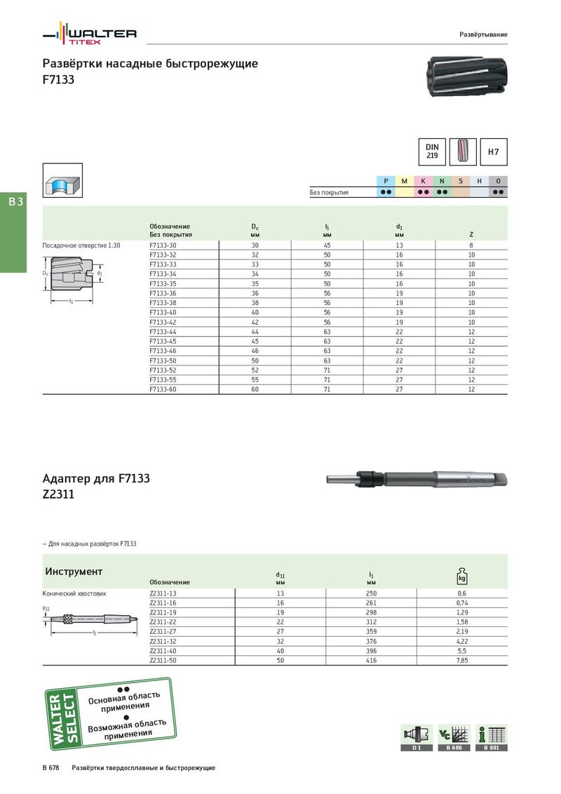 Развёртывание Развёртки насадные быстрорежущие F7133 DIN H7 219 P M K N S H O Без покрытия CC CC CC CC B3 Обозначение Dc l1 d1 Без покрытия мм мм мм Z Посадочное отверстие 1:30 F7133-30 30 45 13 8 F7133-32 32 50 16 10 F7133-33 33 50 16 10 Dc d1 F7133-34 34 50 16 10 F7133-35 35 50 16 10 F7133-36 36 56 19 10 l1 F7133-38 38 56 19 10 F7133-40 40 56 19 10 F7133-42 42 56 19 10 F7133-44 44 63 22 12 F7133-45 45 63 22 12 F7133-46 46 63 22 12 F7133-50 50 63 22 12 F7133-52 52 71 27 12 F7133-55 55 71 27 12 F7133-60 60 71 27 12 Адаптер для F7133 Z2311 – Для насадных развёрток F7133 Инструмент d11 l1 Обозначение мм мм Конический хвостовик Z2311-13 13 250 0,6 d11 Z2311-16 16 261 0,74 Z2311-19 19 298 1,29 Z2311-22 22 312 1,58 l1 Z2311-27 27 359 2,19 Z2311-32 32 376 4,22 Z2311-40 40 396 5,5 Z2311-50 50 416 7,85 Оснпорвинмаеяноебнлиаясть Возмпоржимнаеянеонбиляасть D 1 B 686 B 691 B 678 Развёртки твердосплавные и быстрорежущие