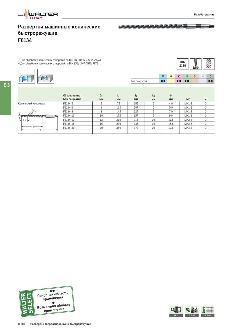 Развёртывание Развёртки машинные конические быстрорежущие F6134 – Для обработки конических отверстий по DIN EN 28736; 28737; 28744 DIN – Для обработки конических отверстий по DIN 258; 1447; 7977; 7978 2180 1:50 P M K N S H O Без покрытия CC CC CC CC B3 Обозначение Dc Lc l1 l15 d3 Без покрытия мм мм мм мм мм MK Z Конический хвостовик F6134-5 5 73 155 5 4,9 MK1 B 3 F6134-6 6 105 187 5 5,9 MK1 B 3 d3 Dc F6134-8 8 145 227 5 7,9 MK1 B 3 F6134-10 10 175 257 5 9,9 MK1 B 3 l15 F6134-12 12 210 315 10 11,8 MK2 B 3 F6134-16 16 230 335 10 15,8 MK2 B 3 Lc F6134-20 20 250 377 10 19,8 MK3 B 3 l1 Оснпорвинмаеяноебнлиаясть Возмпоржимнаеянеонбиляасть D 1 B 686 B 691 B 680 Развёртки твердосплавные и быстрорежущие