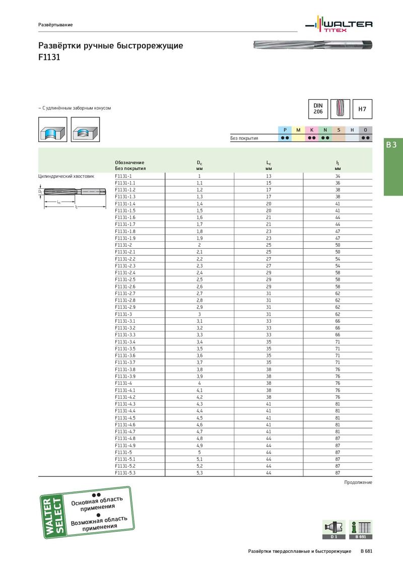 Развёртывание Развёртки ручные быстрорежущие F1131 – С удлинённым заборным конусом DIN H7 206 P M K N S H O Без покрытия CC CC CC CC B3 Обозначение Dc Lc l1 Без покрытия мм мм мм Цилиндрический хвостовик F1131-1 1 13 34 F1131-1.1 1,1 15 36 Dc F1131-1.2 1,2 17 38 F1131-1.3 1,3 17 38 Lc F1131-1.4 1,4 20 41 l1 F1131-1.5 1,5 20 41 F1131-1.6 1,6 21 44 F1131-1.7 1,7 21 44 F1131-1.8 1,8 23 47 F1131-1.9 1,9 23 47 F1131-2 2 25 50 F1131-2.1 2,1 25 50 F1131-2.2 2,2 27 54 F1131-2.3 2,3 27 54 F1131-2.4 2,4 29 58 F1131-2.5 2,5 29 58 F1131-2.6 2,6 29 58 F1131-2.7 2,7 31 62 F1131-2.8 2,8 31 62 F1131-2.9 2,9 31 62 F1131-3 3 31 62 F1131-3.1 3,1 33 66 F1131-3.2 3,2 33 66 F1131-3.3 3,3 33 66 F1131-3.4 3,4 35 71 F1131-3.5 3,5 35 71 F1131-3.6 3,6 35 71 F1131-3.7 3,7 35 71 F1131-3.8 3,8 38 76 F1131-3.9 3,9 38 76 F1131-4 4 38 76 F1131-4.1 4,1 38 76 F1131-4.2 4,2 38 76 F1131-4.3 4,3 41 81 F1131-4.4 4,4 41 81 F1131-4.5 4,5 41 81 F1131-4.6 4,6 41 81 F1131-4.7 4,7 41 81 F1131-4.8 4,8 44 87 F1131-4.9 4,9 44 87 F1131-5 5 44 87 F1131-5.1 5,1 44 87 F1131-5.2 5,2 44 87 F1131-5.3 5,3 44 87 Продолжение Оснпорвинмаеяноебнлиаясть Возмпоржимнаеянеонбиляасть D1 B 691 Развёртки твердосплавные и быстрорежущие B 681