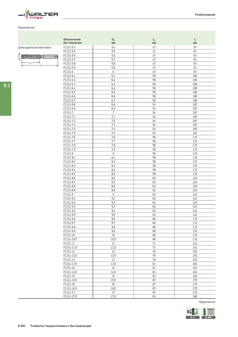 Развёртывание Продолжение Обозначение Dc Lc l1 Без покрытия мм мм мм Цилиндрический хвостовик F1131-5.4 5,4 47 93 F1131-5.5 5,5 47 93 Dc F1131-5.6 5,6 47 93 F1131-5.7 5,7 47 93 Lc F1131-5.8 5,8 47 93 l1 F1131-5.9 5,9 47 93 F1131-6 6 47 93 F1131-6.1 6,1 50 100 F1131-6.2 6,2 50 100 B3 F1131-6.3 6,3 50 100 F1131-6.4 6,4 50 100 F1131-6.5 6,5 50 100 F1131-6.6 6,6 50 100 F1131-6.7 6,7 50 100 F1131-6.8 6,8 54 107 F1131-6.9 6,9 54 107 F1131-7 7 54 107 F1131-7.1 7,1 54 107 F1131-7.2 7,2 54 107 F1131-7.3 7,3 54 107 F1131-7.4 7,4 54 107 F1131-7.5 7,5 54 107 F1131-7.6 7,6 58 115 F1131-7.7 7,7 58 115 F1131-7.8 7,8 58 115 F1131-7.9 7,9 58 115 F1131-8 8 58 115 F1131-8.1 8,1 58 115 F1131-8.2 8,2 58 115 F1131-8.3 8,3 58 115 F1131-8.4 8,4 58 115 F1131-8.5 8,5 58 115 F1131-8.6 8,6 62 124 F1131-8.7 8,7 62 124 F1131-8.8 8,8 62 124 F1131-8.9 8,9 62 124 F1131-9 9 62 124 F1131-9.1 9,1 62 124 F1131-9.2 9,2 62 124 F1131-9.3 9,3 62 124 F1131-9.4 9,4 62 124 F1131-9.5 9,5 62 124 F1131-9.6 9,6 66 133 F1131-9.7 9,7 66 133 F1131-9.8 9,8 66 133 F1131-9.9 9,9 66 133 F1131-10 10 66 133 F1131-10.5 10,5 66 133 F1131-11 11 71 142 F1131-11.5 11,5 71 142 F1131-12 12 76 152 F1131-12.5 12,5 76 152 F1131-13 13 76 152 F1131-13.5 13,5 81 163 F1131-14 14 81 163 F1131-14.5 14,5 81 163 F1131-15 15 81 163 F1131-15.5 15,5 87 175 F1131-16 16 87 175 F1131-16.5 16,5 87 175 F1131-17 17 87 175 F1131-17.5 17,5 93 188 Продолжение D1 B 691 B 682 Развёртки твердосплавные и быстрорежущие