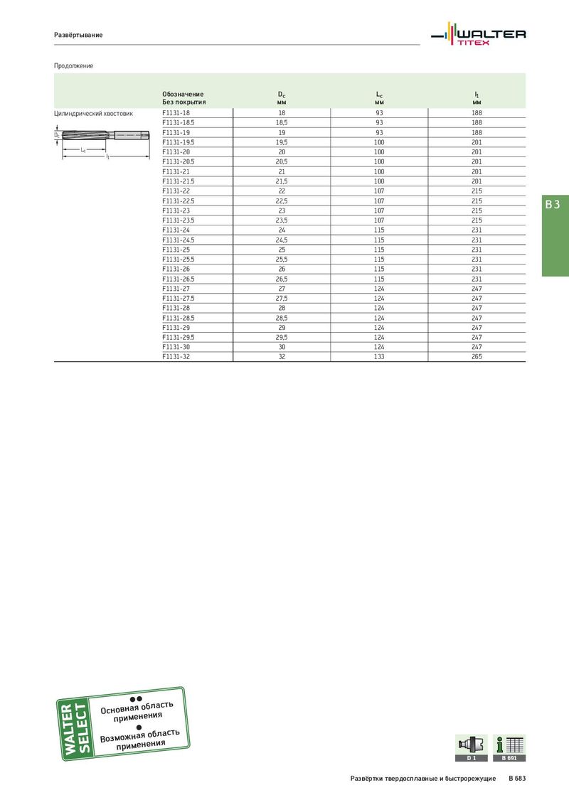 Развёртывание Продолжение Обозначение Dc Lc l1 Без покрытия мм мм мм Цилиндрический хвостовик F1131-18 18 93 188 F1131-18.5 18,5 93 188 Dc F1131-19 19 93 188 F1131-19.5 19,5 100 201 Lc F1131-20 20 100 201 l1 F1131-20.5 20,5 100 201 F1131-21 21 100 201 F1131-21.5 21,5 100 201 F1131-22 22 107 215 F1131-22.5 22,5 107 215 B3 F1131-23 23 107 215 F1131-23.5 23,5 107 215 F1131-24 24 115 231 F1131-24.5 24,5 115 231 F1131-25 25 115 231 F1131-25.5 25,5 115 231 F1131-26 26 115 231 F1131-26.5 26,5 115 231 F1131-27 27 124 247 F1131-27.5 27,5 124 247 F1131-28 28 124 247 F1131-28.5 28,5 124 247 F1131-29 29 124 247 F1131-29.5 29,5 124 247 F1131-30 30 124 247 F1131-32 32 133 265 Оснпорвинмаеяноебнлиаясть Возмпоржимнаеянеонбиляасть D1 B 691 Развёртки твердосплавные и быстрорежущие B 683