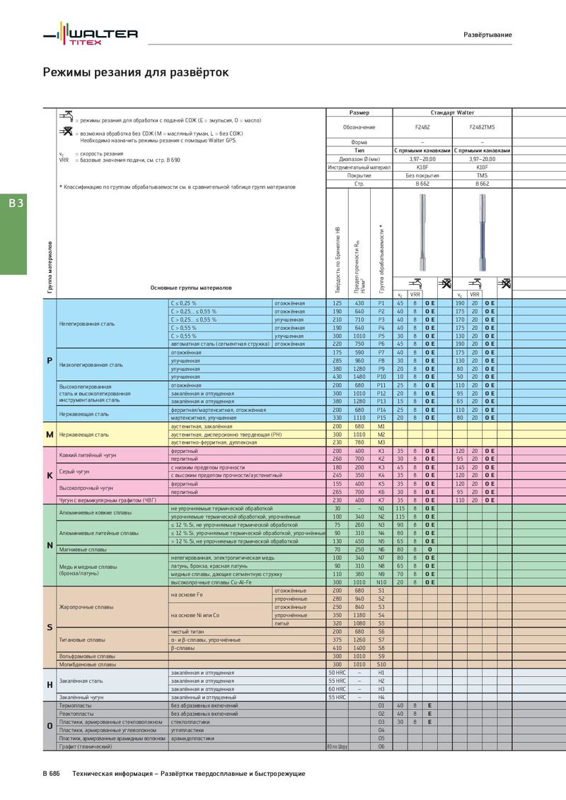 Развёртывание Режимы резания для развёрток Размер Стандарт Walter = режимы резания для обработки с подачей СОЖ (E = эмульсия, O = масло) Обозначение F2482 F2482TMS = возможна обработка без СОЖ (M = масляный туман, L = без СОЖ) Необходимо назначить режимы резания с помощью Walter GPS. Форма – – vc = скорость резания Тип С прямыми канавками С прямыми канавками VRR = базовые значения подачи, см. стр. B 690 Диапазон Ø (мм) 3,97–20,00 3,97–20,00 Инструментальный материал K10F K10F Покрытие Без покрытия TMS * Классификацию по группам обрабатываемости см. в сравнительной таблице групп материалов Стр. B 662 B 662 B3 Группа материалов Основные группы материалов Твёрдость по Бринеллю HB Предел прочности Rm Н/мм2 Группа обрабатываемости * vc VRR vc VRR C ≤ 0,25 % отожжённая 125 430 P1 45 8 O E 190 20 O E C > 0,25... ≤ 0,55 % отожжённая 190 640 P2 40 8 O E 175 20 O E Нелегированная сталь C > 0,25... ≤ 0,55 % улучшенная 210 710 P3 40 8 O E 170 20 O E C > 0,55 % отожжённая 190 640 P4 40 8 O E 175 20 O E C > 0,55 % улучшенная 300 1010 P5 30 8 O E 130 20 O E автоматная сталь (сегментная стружка) отожжённая 220 750 P6 45 8 O E 190 20 O E отожжённая 175 590 P7 40 8 O E 175 20 O E P Низколегированная сталь улучшенная 285 960 P8 30 8 O E 130 20 O E улучшенная 380 1280 P9 20 8 O E 80 20 O E улучшенная 430 1480 P10 10 8 O E 50 20 O E Высоколегированная отожжённая 200 680 P11 25 8 O E 110 20 O E сталь и высоколегированная закалённая и отпущенная 300 1010 P12 20 8 O E 95 20 O E инструментальная сталь закалённая и отпущенная 380 1280 P13 15 8 O E 65 20 O E Нержавеющая сталь ферритная/мартенситная, отожжённая 200 680 P14 25 8 O E 110 20 O E мартенситная, улучшенная 330 1110 P15 20 8 O E 80 20 O E аустенитная, закалённая 200 680 M1 M Нержавеющая сталь аустенитная, дисперсионно твердеющая (PH) 300 1010 M2 аустенитно-ферритная, дуплексная 230 780 M3 Ковкий литейный чугун ферритный 200 400 K1 35 8 OE 120 20 O E перлитный 260 700 K2 30 8 OE 95 20 O E Серый чугун с низким пределом прочности 180 200 K3 45 8 OE 145 20 O E K с высоким пределом прочности/аустенитный 245 350 K4 35 8 OE 120 20 O E Высокопрочный чугун ферритный 155 400 K5 35 8 OE 120 20 O E перлитный 265 700 K6 30 8 OE 95 20 O E Чугун с вермикулярным графитом (ЧВГ) 230 400 K7 35 8 OE 110 20 O E Алюминиевые ковкие сплавы не упрочняемые термической обработкой 30 – N1 115 8 OE упрочняемые термической обработкой, упрочнённые 100 340 N2 115 8 OE ≤ 12 % Si, не упрочняемые термической обработкой 75 260 N3 90 8 OE Алюминиевые литейные сплавы ≤ 12 % Si, упрочняемые термической обработкой, упрочнённые 90 310 N4 80 8 OE N > 12 % Si, не упрочняемые термической обработкой 130 450 N5 65 8 OE Магниевые сплавы 70 250 N6 80 8 O нелегированная, электролитическая медь 100 340 N7 80 8 OE Медь и медные сплавы латунь, бронза, красная латунь 90 310 N8 65 8 OE (бронза/латунь) медные сплавы, дающие сегментную стружку 110 380 N9 70 8 OE высокопрочные сплавы Cu-Al-Fe 300 1010 N10 20 8 OE на основе Fe отожжённые 200 680 S1 упрочнённые 280 940 S2 Жаропрочные сплавы отожжённые 250 840 S3 на основе Ni или Co упрочнённые 350 1180 S4 S литьё 320 1080 S5 чистый титан 200 680 S6 Титановые сплавы α- и β-сплавы, упрочнённые 375 1260 S7 β-сплавы 410 1400 S8 Вольфрамовые сплавы 300 1010 S9 Молибденовые сплавы 300 1010 S10 закалённая и отпущенная 50 HRC – H1 H Закалённая сталь закалённая и отпущенная 55 HRC – H2 закалённая и отпущенная 60 HRC – H3 Закалённый чугун закалённый и отпущенный 55 HRC – H4 Термопласты без абразивных включений O1 40 8 E Реактопласты без абразивных включений O2 40 8 E O Пластики, армированные стекловолокном стеклопластики O3 30 8 E Пластики, армированные углеволокном углепластики O4 Пластики, армированные арамидным волокном арамидопластики O5 Графит (технический) 80 по Шору O6 B 686 Техническая информация – Развёртки твердосплавные и быстрорежущие