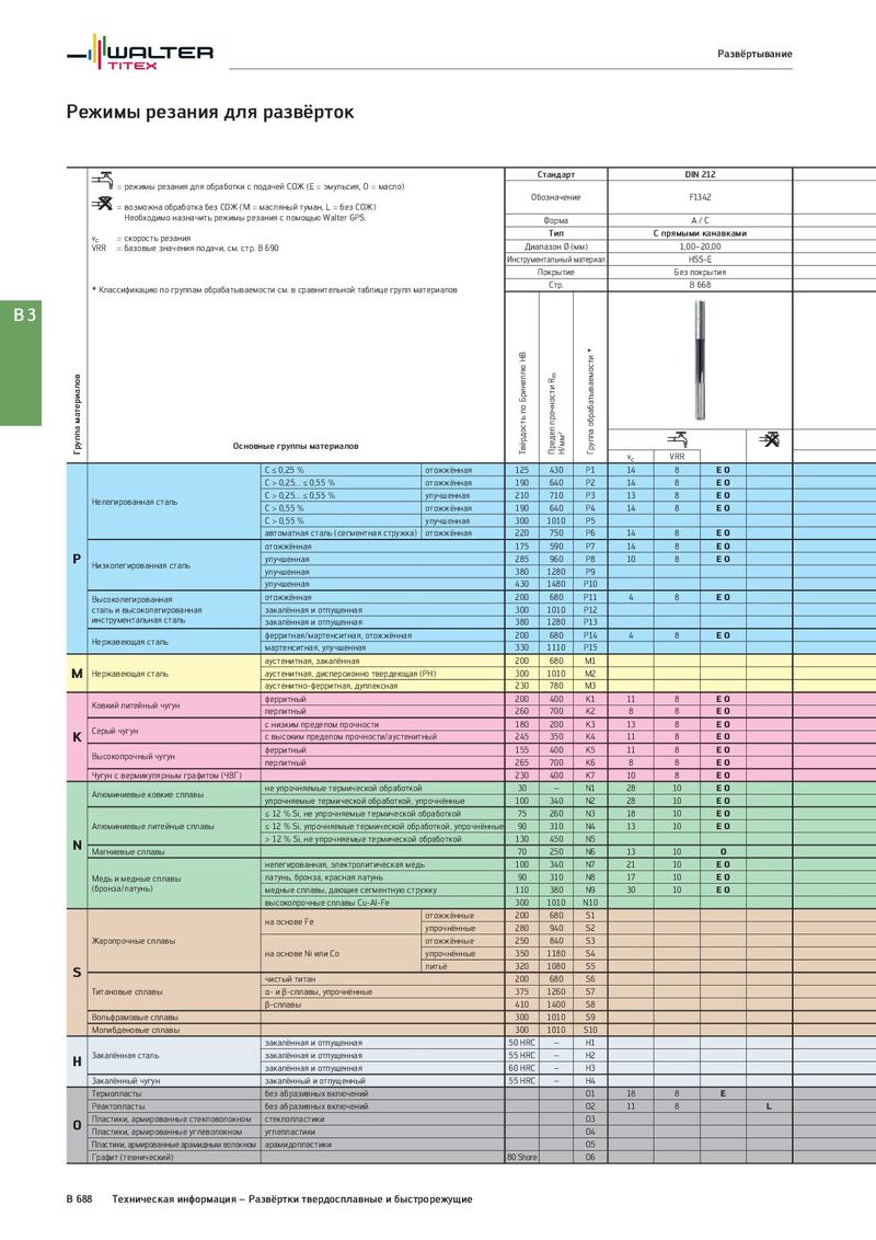 Развёртывание Режимы резания для развёрток Стандарт DIN 212 = режимы резания для обработки с подачей СОЖ (E = эмульсия, O = масло) Обозначение F1342 = возможна обработка без СОЖ (M = масляный туман, L = без СОЖ) Необходимо назначить режимы резания с помощью Walter GPS. Форма A/C vc = скорость резания Тип С прямыми канавками VRR = базовые значения подачи, см. стр. B 690 Диапазон Ø (мм) 1,00–20,00 Инструментальный материал HSS-E Покрытие Без покрытия * Классификацию по группам обрабатываемости см. в сравнительной таблице групп материалов Стр. B 668 B3 Группа материалов Основные группы материалов Твёрдость по Бринеллю HB Предел прочности Rm Н/мм2 Группа обрабатываемости * vc VRR C ≤ 0,25 % отожжённая 125 430 P1 14 8 E O C > 0,25... ≤ 0,55 % отожжённая 190 640 P2 14 8 E O Нелегированная сталь C > 0,25... ≤ 0,55 % улучшенная 210 710 P3 13 8 E O C > 0,55 % отожжённая 190 640 P4 14 8 E O C > 0,55 % улучшенная 300 1010 P5 автоматная сталь (сегментная стружка) отожжённая 220 750 P6 14 8 E O отожжённая 175 590 P7 14 8 E O P Низколегированная сталь улучшенная 285 960 P8 10 8 E O улучшенная 380 1280 P9 улучшенная 430 1480 P10 Высоколегированная отожжённая 200 680 P11 4 8 E O сталь и высоколегированная закалённая и отпущенная 300 1010 P12 инструментальная сталь закалённая и отпущенная 380 1280 P13 Нержавеющая сталь ферритная/мартенситная, отожжённая 200 680 P14 4 8 E O мартенситная, улучшенная 330 1110 P15 аустенитная, закалённая 200 680 M1 M Нержавеющая сталь аустенитная, дисперсионно твердеющая (PH) 300 1010 M2 аустенитно-ферритная, дуплексная 230 780 M3 Ковкий литейный чугун ферритный 200 400 K1 11 8 E O перлитный 260 700 K2 8 8 E O Серый чугун с низким пределом прочности 180 200 K3 13 8 E O K с высоким пределом прочности/аустенитный 245 350 K4 11 8 E O Высокопрочный чугун ферритный 155 400 K5 11 8 E O перлитный 265 700 K6 8 8 E O Чугун с вермикулярным графитом (ЧВГ) 230 400 K7 10 8 E O Алюминиевые ковкие сплавы не упрочняемые термической обработкой 30 – N1 28 10 E O упрочняемые термической обработкой, упрочнённые 100 340 N2 28 10 E O ≤ 12 % Si, не упрочняемые термической обработкой 75 260 N3 18 10 E O Алюминиевые литейные сплавы ≤ 12 % Si, упрочняемые термической обработкой, упрочнённые 90 310 N4 13 10 E O N > 12 % Si, не упрочняемые термической обработкой 130 450 N5 Магниевые сплавы 70 250 N6 13 10 O нелегированная, электролитическая медь 100 340 N7 21 10 EO Медь и медные сплавы латунь, бронза, красная латунь 90 310 N8 17 10 EO (бронза/латунь) медные сплавы, дающие сегментную стружку 110 380 N9 30 10 EO высокопрочные сплавы Cu-Al-Fe 300 1010 N10 на основе Fe отожжённые 200 680 S1 упрочнённые 280 940 S2 Жаропрочные сплавы отожжённые 250 840 S3 на основе Ni или Co упрочнённые 350 1180 S4 S литьё 320 1080 S5 чистый титан 200 680 S6 Титановые сплавы α- и β-сплавы, упрочнённые 375 1260 S7 β-сплавы 410 1400 S8 Вольфрамовые сплавы 300 1010 S9 Молибденовые сплавы 300 1010 S10 закалённая и отпущенная 50 HRC – H1 H Закалённая сталь закалённая и отпущенная 55 HRC – H2 закалённая и отпущенная 60 HRC – H3 Закалённый чугун закалённый и отпущенный 55 HRC – H4 Термопласты без абразивных включений O1 18 8 E Реактопласты без абразивных включений O2 11 8 L O Пластики, армированные стекловолокном стеклопластики O3 Пластики, армированные углеволокном углепластики O4 Пластики, армированные арамидным волокном арамидопластики O5 Графит (технический) 80 Shore O6 B 688 Техническая информация – Развёртки твердосплавные и быстрорежущие
