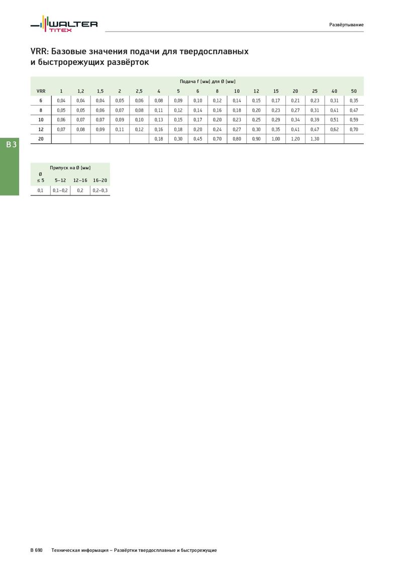 Развёртывание VRR: Базовые значения подачи для твердосплавных и быстрорежущих развёрток Подача f [мм] для Ø [мм] VRR 1 1,2 1,5 2 2,5 4 5 6 8 10 12 15 20 25 40 50 6 0,04 0,04 0,04 0,05 0,06 0,08 0,09 0,10 0,12 0,14 0,15 0,17 0,21 0,23 0,31 0,35 8 0,05 0,05 0,06 0,07 0,08 0,11 0,12 0,14 0,16 0,18 0,20 0,23 0,27 0,31 0,41 0,47 10 0,06 0,07 0,07 0,09 0,10 0,13 0,15 0,17 0,20 0,23 0,25 0,29 0,34 0,39 0,51 0,59 12 0,07 0,08 0,09 0,11 0,12 0,16 0,18 0,20 0,24 0,27 0,30 0,35 0,41 0,47 0,62 0,70 20 0,18 0,30 0,45 0,70 0,80 0,90 1,00 1,20 1,30 B3 Припуск на Ø [мм] Ø ≤5 5–12 12–16 16–20 0,1 0,1–0,2 0,2 0,2–0,3 B 690 Техническая информация – Развёртки твердосплавные и быстрорежущие