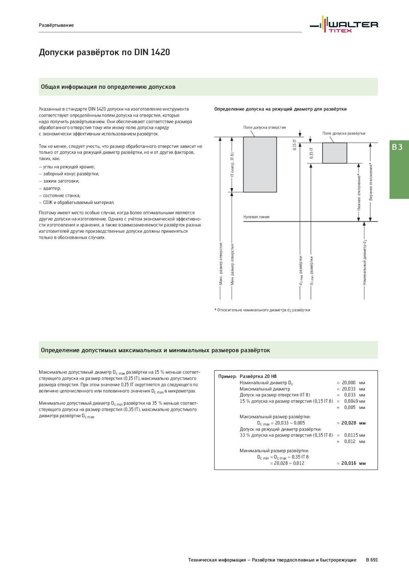 Развёртывание Допуски развёрток по DIN 1420 Общая информация по определению допусков Указанные в стандарте DIN 1420 допуски на изоготовление инструмента Определение допуска на режущий диаметр для развёртки соответствуют определённым полям допуска на отверстия, которые надо получить развёртыванием. Они обеспечивают соответствие размера обработанного отверстия тому или иному полю допуска наряду Поле допуска отверстия с экономически эффективным использованием развёрток. Поле допуска развёртки Тем не менее, следует учесть, что размер обработанного отверстия зависит не 0,15 IT 0,35 IT B3 только от допуска на режущий диаметр развёртки, но и от других факторов, IT (напр., IT 8) таких, как: − углы на режущей кромке; Верхнее отклонение* − заборный конус развёртки; Нижнее отклонение* − зажим заготовки; − адаптер; − состояние станка; − СОЖ и обрабатываемый материал. Поэтому имеют место особые случаи, когда более оптимальными являются другие допуски на изготовление. Однако c учётом экономической эффективно- Нулевая линия сти изготовления и хранения, а также взаимозаменяемости развёрток разных изготовителей другие производственные допуски должны применяться только в обоснованных случаях. Макс. размер отверстия d1 Мин. размер отверстия d1 max развёртки d1 min развёртки Номинальный диаметр * Относительно номинального диаметра d1 развёртки Определение допустимых максимальных и минимальных размеров развёрток Максимально допустимый диаметр Dc max развёртки на 15 % меньше соответ- Пример: Развёртка 20 H8 ствующего допуска на размер отверстия (0,15 IT), максимально допустимого размера отверстия. При этом значение 0,15 IT округляется до следующего по Номинальный диаметр Dc = 20,000 мм величине целочисленного или половинного значения Dc max в микрометрах. Максимальный диаметр = 20,033 мм Допуск на размер отверстия (IT 8) = 0,033 мм Минимально допустимый диаметр Dc min развёртки на 35 % меньше соответ- 15 % допуска на размер отверстия (0,15 IT 8) = 0,0049 мм ствующего допуска на размер отверстия (0,35 IT), максимально допустимого ≈ 0,005 мм диаметра развёртки Dc max. Максимальный размер развёртки: Dc max = 20,033 – 0,005 = 20,028 мм Допуск на режущий диаметр развёртки: 33 % допуска на размер отверстия (0,35 IT 8) = 0,0115 мм ≈ 0,012 мм Минимальный размер развёртки: Dc min = Dc max – 0,35 IT 8 = 20,028 – 0,012 = 20,016 мм Техническая информация – Развёртки твердосплавные и быстрорежущие B 691