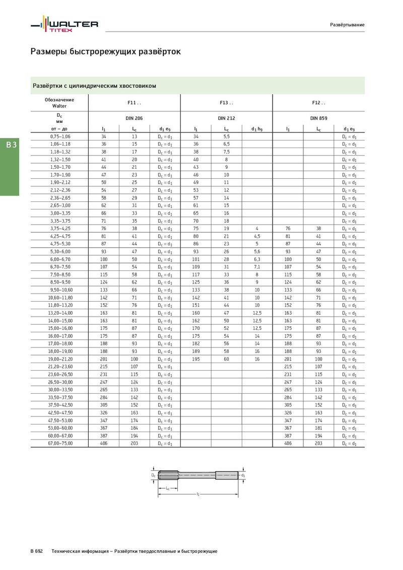 Развёртывание Размеры быстрорежущих развёрток Развёртки с цилиндрическим хвостовиком Обозначение F11 . . F13 . . F12 . . Walter Dc DIN 206 DIN 212 DIN 859 мм от – до l1 Lc d1 e9 l1 Lc d1 h9 l1 Lc d1 e9 0,75–1,06 34 13 Dc = d1 34 5,5 Dc = d1 B3 1,06–1,18 36 15 Dc = d1 36 6,5 Dc = d1 1,18–1,32 38 17 Dc = d1 38 7,5 Dc = d1 1,32–1,50 41 20 Dc = d1 40 8 Dc = d1 1,50–1,70 44 21 Dc = d1 43 9 Dc = d1 1,70–1,90 47 23 Dc = d1 46 10 Dc = d1 1,90–2,12 50 25 Dc = d1 49 11 Dc = d1 2,12–2,36 54 27 Dc = d1 53 12 Dc = d1 2,36–2,65 58 29 Dc = d1 57 14 Dc = d1 2,65–3,00 62 31 Dc = d1 61 15 Dc = d1 3,00–3,35 66 33 Dc = d1 65 16 Dc = d1 3,35–3,75 71 35 Dc = d1 70 18 Dc = d1 3,75–4,25 76 38 Dc = d1 75 19 4 76 38 Dc = d1 4,25–4,75 81 41 Dc = d1 80 21 4,5 81 41 Dc = d1 4,75–5,30 87 44 Dc = d1 86 23 5 87 44 Dc = d1 5,30–6,00 93 47 Dc = d1 93 26 5,6 93 47 Dc = d1 6,00–6,70 100 50 Dc = d1 101 28 6,3 100 50 Dc = d1 6,70–7,50 107 54 Dc = d1 109 31 7,1 107 54 Dc = d1 7,50–8,50 115 58 Dc = d1 117 33 8 115 58 Dc = d1 8,50–9,50 124 62 Dc = d1 125 36 9 124 62 Dc = d1 9,50–10,60 133 66 Dc = d1 133 38 10 133 66 Dc = d1 10,60–11,80 142 71 Dc = d1 142 41 10 142 71 Dc = d1 11,80–13,20 152 76 Dc = d1 151 44 10 152 76 Dc = d1 13,20–14,00 163 81 Dc = d1 160 47 12,5 163 81 Dc = d1 14,00–15,00 163 81 Dc = d1 162 50 12,5 163 81 Dc = d1 15,00–16,00 175 87 Dc = d1 170 52 12,5 175 87 Dc = d1 16,00–17,00 175 87 Dc = d1 175 54 14 175 87 Dc = d1 17,00–18,00 188 93 Dc = d1 182 56 14 188 93 Dc = d1 18,00–19,00 188 93 Dc = d1 189 58 16 188 93 Dc = d1 19,00–21,20 201 100 Dc = d1 195 60 16 201 100 Dc = d1 21,20–23,60 215 107 Dc = d1 215 107 Dc = d1 23,60–26,50 231 115 Dc = d1 231 115 Dc = d1 26,50–30,00 247 124 Dc = d1 247 124 Dc = d1 30,00–33,50 265 133 Dc = d1 265 133 Dc = d1 33,50–37,50 284 142 Dc = d1 284 142 Dc = d1 37,50–42,50 305 152 Dc = d1 305 152 Dc = d1 42,50–47,50 326 163 Dc = d1 326 163 Dc = d1 47,50–53,00 347 174 Dc = d1 347 174 Dc = d1 53,00–60,00 367 184 Dc = d1 367 181 Dc = d1 60,00–67,00 387 194 Dc = d1 387 194 Dc = d1 67,00–75,00 406 203 Dc = d1 406 203 Dc = d1 Dc d1 Lc l1 B 692 Техническая информация – Развёртки твердосплавные и быстрорежущие