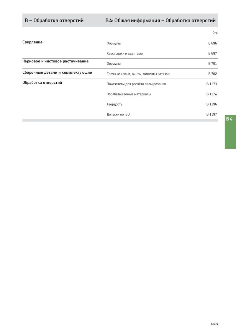 B – Обработка отверстий B 4: Общая информация – Обработка отверстий Стр. Сверление Формулы B 696 Хвостовики и адаптеры B 697 Черновое и чистовое растачивание Формулы B 701 Сборочные детали и комплектующие Гаечные ключи, винты, моменты затяжки B 702 Обработка отверстий Показатели для расчёта силы резания B 1173 Обрабатываемые материалы B 1174 Твёрдость B 1196 Допуски по ISO B 1197 B4 B 695