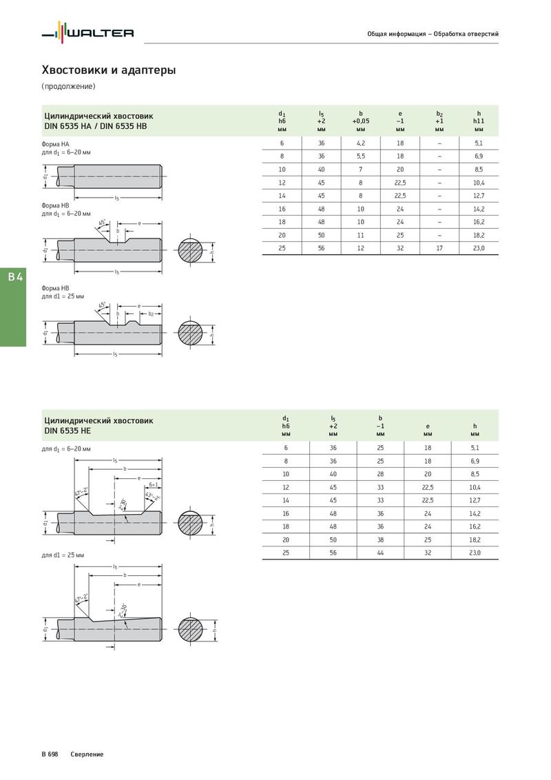 Общая информация – Обработка отверстий Хвостовики и адаптеры (продолжение) Цилиндрический хвостовик d1 l5 b e b2 h DIN 6535 HA / DIN 6535 HB h6 +2 +0,05 –1 +1 h11 мм мм мм мм мм мм Форма HA 6 36 4,2 18 – 5,1 для d1 = 6–20 мм 8 36 5,5 18 – 6,9 10 40 7 20 – 8,5 d1 12 45 8 22,5 – 10,4 l5 14 45 8 22,5 – 12,7 Форма HB 16 48 10 24 – 14,2 для d1 = 6–20 мм 45° e 18 48 10 24 – 16,2 b 20 50 11 25 – 18,2 d1 h 25 56 12 32 17 23,0 B4 l5 Форма HB для d1 = 25 мм 45° e b b2 d1 h l5 Цилиндрический хвостовик d1 l5 b DIN 6535 HE h6 +2 –1 e h мм мм мм мм мм для d1 = 6–20 мм 6 36 25 18 5,1 l5 8 36 25 18 6,9 b e 10 40 28 20 8,5 47°–2° 6+1 12 45 33 22,5 10,4 2°30’ 43°–2° 14 45 33 22,5 12,7 16 48 36 24 14,2 d1 h 18 48 36 24 16,2 20 50 38 25 18,2 для d1 = 25 мм 25 56 44 32 23,0 l5 b e 47°–2° 2°–30’ d1 h B 698 Сверление