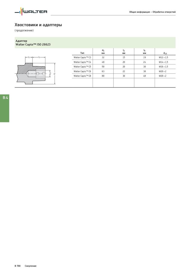 Общая информация – Обработка отверстий Хвостовики и адаптеры (продолжение) Адаптер Walter Capto™ ISO 26623 d1 l2 l5 Тип мм мм мм d13 l2 l5 Walter Capto™ C3 32 15 19 M12 × 1,5 Walter Capto™ C4 40 20 24 M14 × 1,5 Walter Capto™ C5 50 20 30 M16 × 1,5 Walter Capto™ C6 63 22 38 M20 × 2 d13 d1 Walter Capto™ C8 80 30 48 M20 × 2 B4 B 700 Сверление