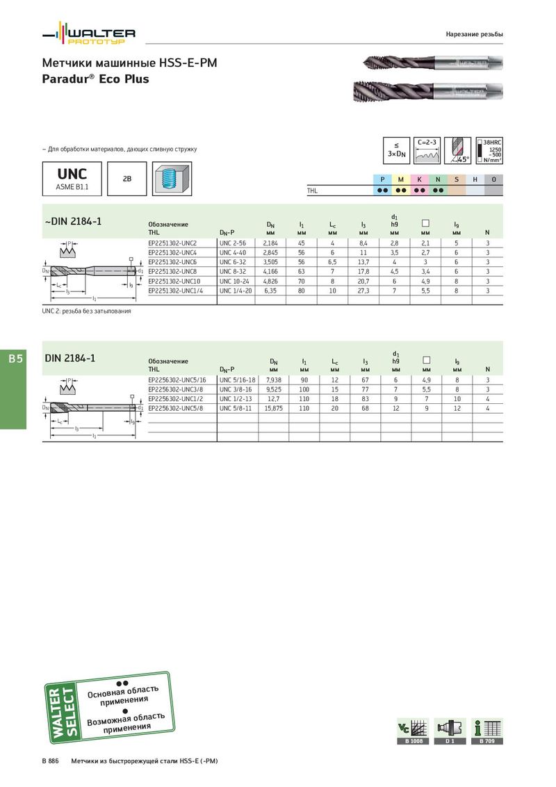 Нарезание резьбы Метчики машинные HSS-E-PM Paradur® Eco Plus ≤ C=2-3 38HRC – Для обработки материалов, дающих сливную стружку 3×DN 1250 45° –500 N/mm² UNC 2B P M K N S H O ASME B1.1 THL CC CC CC CC ~DIN 2184-1 d1 Обозначение DN l1 Lc l3 h9 l9 THL DN-P мм мм мм мм мм мм мм N P EP2251302-UNC2 UNC 2-56 2,184 45 4 8,4 2,8 2,1 5 3 EP2251302-UNC4 UNC 4-40 2,845 56 6 11 3,5 2,7 6 3 EP2251302-UNC6 UNC 6-32 3,505 56 6,5 13,7 4 3 6 3 DN d1 EP2251302-UNC8 UNC 8-32 4,166 63 7 17,8 4,5 3,4 6 3 Lc l9 EP2251302-UNC10 UNC 10-24 4,826 70 8 20,7 6 4,9 8 3 l3 EP2251302-UNC1/4 UNC 1/4-20 6,35 80 10 27,3 7 5,5 8 3 l1 UNC 2: резьба без затылования B5 DIN 2184-1 d1 Обозначение DN l1 Lc l3 h9 l9 THL DN-P мм мм мм мм мм мм мм N P EP2256302-UNC5/16 UNC 5/16-18 7,938 90 12 67 6 4,9 8 3 EP2256302-UNC3/8 UNC 3/8-16 9,525 100 15 77 7 5,5 8 3 EP2256302-UNC1/2 UNC 1/2-13 12,7 110 18 83 9 7 10 4 DN d1 EP2256302-UNC5/8 UNC 5/8-11 15,875 110 20 68 12 9 12 4 Lc l9 l3 l1 Оснпорвинмаеяноебнлиаясть Возмпоржимнаеянеонбиляасть B 1008 D1 B 709 B 886 Метчики из быстрорежущей стали HSS-E (-PM)