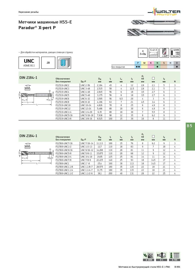 Нарезание резьбы Метчики машинные HSS-E Paradur® X·pert P ≤ C=2-3 32HRC – Для обработки материалов, дающих сливную стружку 3×DN 1000 45° –200 N/mm² UNC 2B P M K N S H O ASME B1.1 Без покрытия CC C C DIN 2184-1 d1 Обозначение DN l1 Lc l3 h9 l9 Без покрытия DN-P мм мм мм мм мм мм мм N P P22519-UNC2 UNC 2-56 2,184 45 4 12 2,8 2,1 5 3 P22519-UNC3 UNC 3-48 2,515 50 4 12,5 2,8 2,1 5 3 P22519-UNC4 UNC 4-40 2,845 56 6 18 3,5 2,7 6 3 DN d1 P22519-UNC5 UNC 5-40 3,175 56 6 18 3,5 2,7 6 3 Lc l9 P22519-UNC6 UNC 6-32 3,505 56 6,5 20 4 3 6 3 l3 P22519-UNC8 UNC 8-32 4,166 63 7 21 4,5 3,4 6 3 l1 P22519-UNC10 UNC 10-24 4,826 70 8 25 6 4,9 8 3 P22519-UNC12 UNC 12-24 5,486 80 10 30 6 4,9 8 3 P22519-UNC1/4 UNC 1/4-20 6,35 80 10 30 7 5,5 8 3 P22519-UNC5/16 UNC 5/16-18 7,938 90 12 35 8 6,2 9 3 P22519-UNC3/8 UNC 3/8-16 9,525 100 15 39 10 8 11 3 B5 DIN 2184-1 d1 Обозначение DN l1 Lc l3 h9 l9 Без покрытия DN-P мм мм мм мм мм мм мм N P P22569-UNC7/16 UNC 7/16-14 11,113 100 15 76 8 6,2 9 3 P22569-UNC1/2 UNC 1/2-13 12,7 110 18 83 9 7 10 4 P22569-UNC9/16 UNC 9/16-12 14,288 110 20 81 11 9 12 4 DN d1 P22569-UNC5/8 UNC 5/8-11 15,875 110 20 68 12 9 12 4 Lc l9 P22569-UNC3/4 UNC 3/4-10 19,05 125 25 81 14 11 14 4 l3 P22569-UNC7/8 UNC 7/8-9 22,225 140 25 93 18 14,5 17 4 l1 P22569-UNC1 UNC 1“-8 25,4 160 30 113 18 14,5 17 4 P22569-UNC1.1/8 UNC 1.1/8-7 28,575 180 35 115 22 18 21 4 P22569-UNC1.1/4 UNC 1.1/4-7 31,75 180 35 115 22 18 21 4 P22569-UNC1.1/2 UNC 1.1/2-6 38,1 200 40 131 28 22 25 4 B 1008 D1 B 709 Метчики из быстрорежущей стали HSS-E (-PM) B 891
