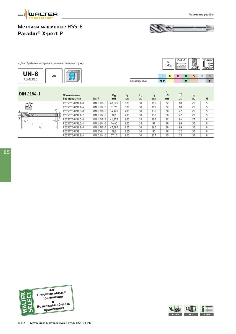 Нарезание резьбы Метчики машинные HSS-E Paradur® X·pert P ≤ C=2-3 32HRC – Для обработки материалов, дающих сливную стружку 3×DN 1000 45° –200 N/mm² UN-8 2B P M K N S H O ASME B1.1 Без покрытия CC C C DIN 2184-1 d1 Обозначение DN l1 Lc l3 h9 l9 Без покрытия DN-P мм мм мм мм мм мм мм N P P265676-UN1.1/8 UN 1.1/8-8 28,575 180 30 115 22 18 21 5 P265676-UN1.1/4 UN 1.1/4-8 31,75 180 30 115 22 18 21 5 P265676-UN1.3/8 UN 1.3/8-8 34,925 200 30 131 28 22 25 5 DN d1 P265676-UN1.1/2 UN 1.1/2-8 38,1 200 30 131 28 22 25 5 Lc l9 P265676-UN1.5/8 UN 1.5/8-8 41,275 200 33 102 32 24 27 6 l3 P265676-UN1.3/4 UN 1.3/4-8 44,45 200 33 97 36 29 32 6 l1 P265676-UN1.7/8 UN 1.7/8-8 47,625 225 36 122 36 29 32 6 P265676-UN2 UN 2“-8 50,8 225 36 95 40 32 35 6 P265676-UN2.1/4 UN 2.1/4-8 57,15 250 36 117 45 35 38 6 B5 Оснпорвинмаеяноебнлиаясть Возмпоржимнаеянеонбиляасть B 1008 D1 B 709 B 892 Метчики из быстрорежущей стали HSS-E (-PM)