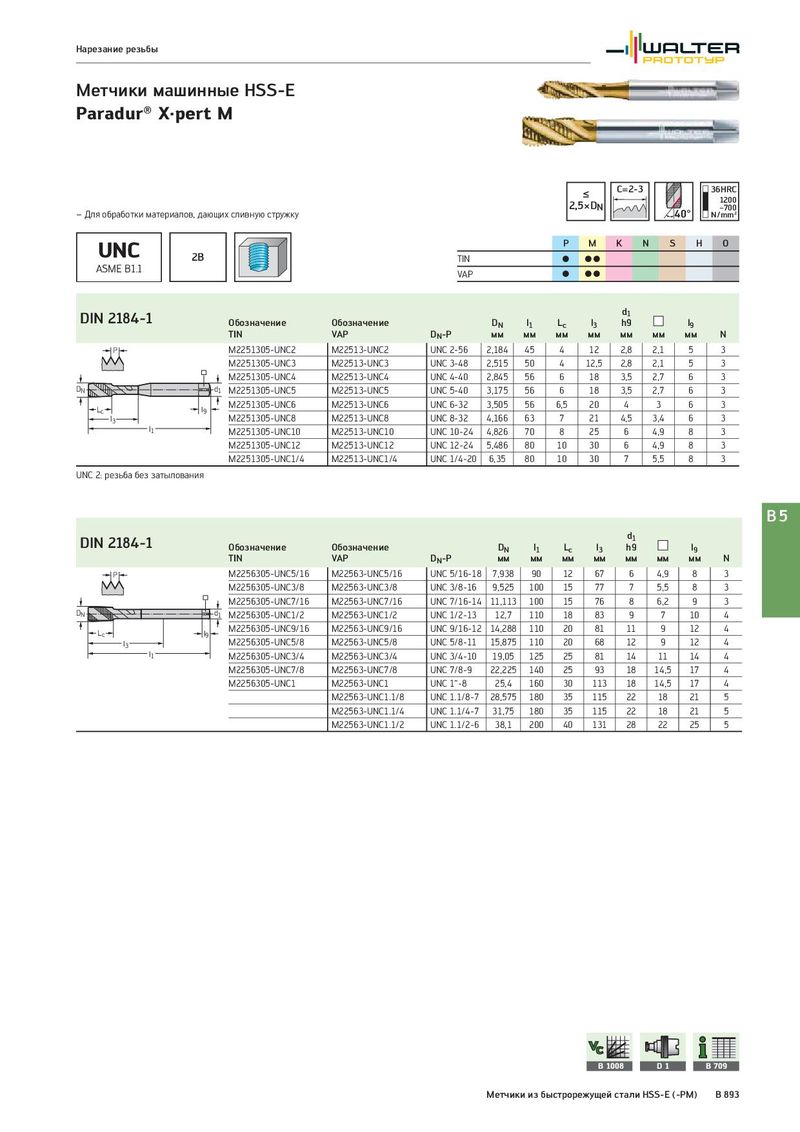 Нарезание резьбы Метчики машинные HSS-E Paradur® X·pert M ≤ C=2-3 36HRC 2,5×DN 1200 – Для обработки материалов, дающих сливную стружку 40° –700 N/mm² UNC P M K N S H O 2B TIN C CC ASME B1.1 VAP C CC DIN 2184-1 d1 Обозначение Обозначение DN l1 Lc l3 h9 l9 TIN VAP DN-P мм мм мм мм мм мм мм N P M2251305-UNC2 M22513-UNC2 UNC 2-56 2,184 45 4 12 2,8 2,1 5 3 M2251305-UNC3 M22513-UNC3 UNC 3-48 2,515 50 4 12,5 2,8 2,1 5 3 M2251305-UNC4 M22513-UNC4 UNC 4-40 2,845 56 6 18 3,5 2,7 6 3 DN d1 M2251305-UNC5 M22513-UNC5 UNC 5-40 3,175 56 6 18 3,5 2,7 6 3 Lc l9 M2251305-UNC6 M22513-UNC6 UNC 6-32 3,505 56 6,5 20 4 3 6 3 l3 M2251305-UNC8 M22513-UNC8 UNC 8-32 4,166 63 7 21 4,5 3,4 6 3 l1 M2251305-UNC10 M22513-UNC10 UNC 10-24 4,826 70 8 25 6 4,9 8 3 M2251305-UNC12 M22513-UNC12 UNC 12-24 5,486 80 10 30 6 4,9 8 3 M2251305-UNC1/4 M22513-UNC1/4 UNC 1/4-20 6,35 80 10 30 7 5,5 8 3 UNC 2: резьба без затылования B5 DIN 2184-1 d1 Обозначение Обозначение DN l1 Lc l3 h9 l9 TIN VAP DN-P мм мм мм мм мм мм мм N P M2256305-UNC5/16 M22563-UNC5/16 UNC 5/16-18 7,938 90 12 67 6 4,9 8 3 M2256305-UNC3/8 M22563-UNC3/8 UNC 3/8-16 9,525 100 15 77 7 5,5 8 3 M2256305-UNC7/16 M22563-UNC7/16 UNC 7/16-14 11,113 100 15 76 8 6,2 9 3 DN d1 M2256305-UNC1/2 M22563-UNC1/2 UNC 1/2-13 12,7 110 18 83 9 7 10 4 Lc l9 M2256305-UNC9/16 M22563-UNC9/16 UNC 9/16-12 14,288 110 20 81 11 9 12 4 l3 M2256305-UNC5/8 M22563-UNC5/8 UNC 5/8-11 15,875 110 20 68 12 9 12 4 l1 M2256305-UNC3/4 M22563-UNC3/4 UNC 3/4-10 19,05 125 25 81 14 11 14 4 M2256305-UNC7/8 M22563-UNC7/8 UNC 7/8-9 22,225 140 25 93 18 14,5 17 4 M2256305-UNC1 M22563-UNC1 UNC 1“-8 25,4 160 30 113 18 14,5 17 4 M22563-UNC1.1/8 UNC 1.1/8-7 28,575 180 35 115 22 18 21 5 M22563-UNC1.1/4 UNC 1.1/4-7 31,75 180 35 115 22 18 21 5 M22563-UNC1.1/2 UNC 1.1/2-6 38,1 200 40 131 28 22 25 5 B 1008 D1 B 709 Метчики из быстрорежущей стали HSS-E (-PM) B 893