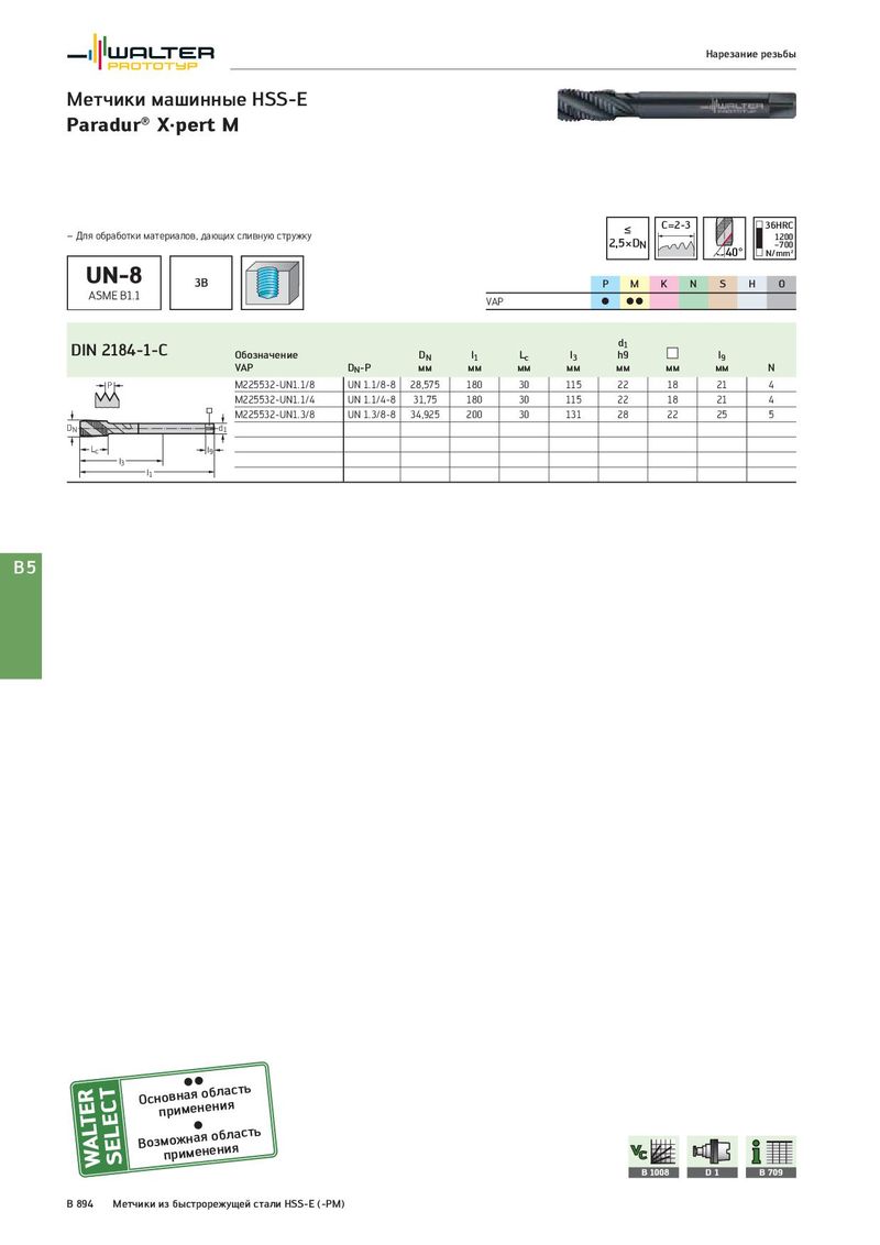 Нарезание резьбы Метчики машинные HSS-E Paradur® X·pert M ≤ C=2-3 36HRC – Для обработки материалов, дающих сливную стружку 2,5×DN 1200 40° –700 N/mm² UN-8 3B P M K N S H O ASME B1.1 VAP C CC DIN 2184-1-C d1 Обозначение DN l1 Lc l3 h9 l9 VAP DN-P мм мм мм мм мм мм мм N P M225532-UN1.1/8 UN 1.1/8-8 28,575 180 30 115 22 18 21 4 M225532-UN1.1/4 UN 1.1/4-8 31,75 180 30 115 22 18 21 4 M225532-UN1.3/8 UN 1.3/8-8 34,925 200 30 131 28 22 25 5 DN d1 Lc l9 l3 l1 B5 Оснпорвинмаеяноебнлиаясть Возмпоржимнаеянеонбиляасть B 1008 D1 B 709 B 894 Метчики из быстрорежущей стали HSS-E (-PM)