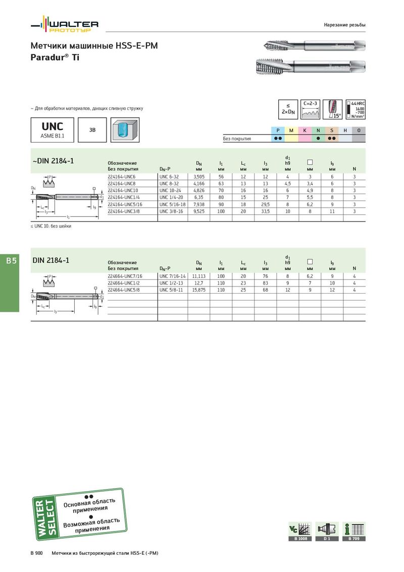 Нарезание резьбы Метчики машинные HSS-E-PM Paradur® Ti ≤ C=2-3 44HRC – Для обработки материалов, дающих сливную стружку 2×DN 1400 15° –700 N/mm² UNC 3B P M K N S H O ASME B1.1 Без покрытия CC C CC ~DIN 2184-1 d1 Обозначение DN l1 Lc l3 h9 l9 Без покрытия DN-P мм мм мм мм мм мм мм N P 224164-UNC6 UNC 6-32 3,505 56 12 12 4 3 6 3 224164-UNC8 UNC 8-32 4,166 63 13 13 4,5 3,4 6 3 DN 224164-UNC10 UNC 10-24 4,826 70 16 16 6 4,9 8 3 d1 224164-UNC1/4 UNC 1/4-20 6,35 80 15 25 7 5,5 8 3 Lc l9 224164-UNC5/16 UNC 5/16-18 7,938 90 18 29,5 8 6,2 9 3 l3 224164-UNC3/8 UNC 3/8-16 9,525 100 20 33,5 10 8 11 3 l1 ≤ UNC 10: без шейки B5 DIN 2184-1 d1 Обозначение DN l1 Lc l3 h9 l9 Без покрытия DN-P мм мм мм мм мм мм мм N P 224664-UNC7/16 UNC 7/16-14 11,113 100 20 76 8 6,2 9 4 224664-UNC1/2 UNC 1/2-13 12,7 110 23 83 9 7 10 4 224664-UNC5/8 UNC 5/8-11 15,875 110 25 68 12 9 12 4 DN d1 Lc l9 l3 Оснпорвинмаеяноебнлиаясть Возмпоржимнаеянеонбиляасть B 1008 D1 B 709 B 900 Метчики из быстрорежущей стали HSS-E (-PM)