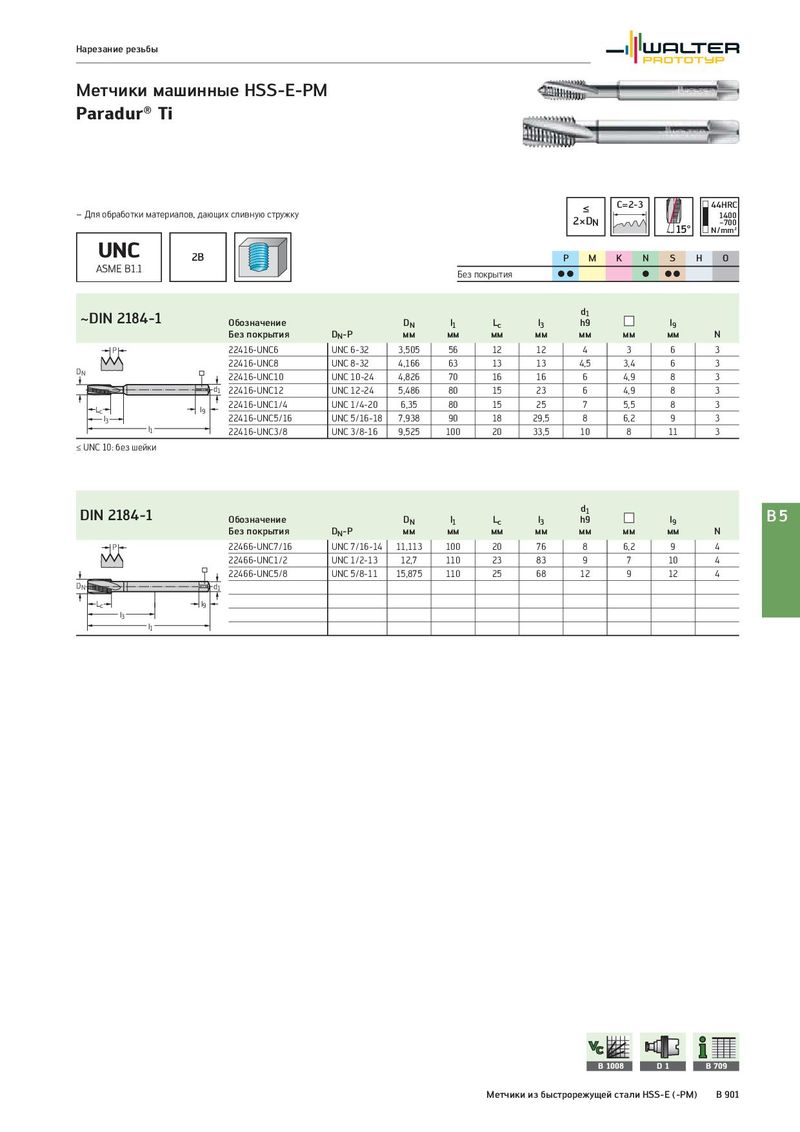 Нарезание резьбы Метчики машинные HSS-E-PM Paradur® Ti ≤ C=2-3 44HRC – Для обработки материалов, дающих сливную стружку 2×DN 1400 15° –700 N/mm² UNC 2B P M K N S H O ASME B1.1 Без покрытия CC C CC ~DIN 2184-1 d1 Обозначение DN l1 Lc l3 h9 l9 Без покрытия DN-P мм мм мм мм мм мм мм N P 22416-UNC6 UNC 6-32 3,505 56 12 12 4 3 6 3 22416-UNC8 UNC 8-32 4,166 63 13 13 4,5 3,4 6 3 DN 22416-UNC10 UNC 10-24 4,826 70 16 16 6 4,9 8 3 d1 22416-UNC12 UNC 12-24 5,486 80 15 23 6 4,9 8 3 Lc l9 22416-UNC1/4 UNC 1/4-20 6,35 80 15 25 7 5,5 8 3 l3 22416-UNC5/16 UNC 5/16-18 7,938 90 18 29,5 8 6,2 9 3 l1 22416-UNC3/8 UNC 3/8-16 9,525 100 20 33,5 10 8 11 3 ≤ UNC 10: без шейки DIN 2184-1 d1 B5 Обозначение DN l1 Lc l3 h9 l9 Без покрытия DN-P мм мм мм мм мм мм мм N P 22466-UNC7/16 UNC 7/16-14 11,113 100 20 76 8 6,2 9 4 22466-UNC1/2 UNC 1/2-13 12,7 110 23 83 9 7 10 4 22466-UNC5/8 UNC 5/8-11 15,875 110 25 68 12 9 12 4 DN d1 Lc l9 l3 l1 B 1008 D1 B 709 Метчики из быстрорежущей стали HSS-E (-PM) B 901