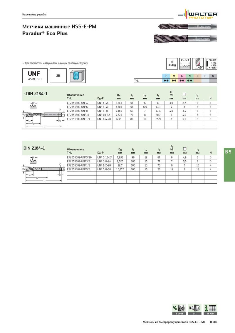 Нарезание резьбы Метчики машинные HSS-E-PM Paradur® Eco Plus ≤ C=2-3 38HRC – Для обработки материалов, дающих сливную стружку 3×DN 1250 45° –500 N/mm² UNF 2B P M K N S H O ASME B1.1 THL CC CC CC CC ~DIN 2184-1 d1 Обозначение DN l1 Lc l3 h9 l9 THL DN-P мм мм мм мм мм мм мм N P EP2351302-UNF4 UNF 4-48 2,845 56 6 11 3,5 2,7 6 3 EP2351302-UNF6 UNF 6-40 3,505 56 6,5 13,1 4 3 6 3 EP2351302-UNF8 UNF 8-36 4,166 63 7 17,4 4,5 3,4 6 3 DN d1 EP2351302-UNF10 UNF 10-32 4,826 70 8 20,7 6 4,9 8 3 Lc l9 EP2351302-UNF1/4 UNF 1/4-28 6,35 80 10 25,9 7 5,5 8 3 l3 l1 DIN 2184-1 d1 Обозначение DN l1 Lc l3 h9 l9 B5 THL DN-P мм мм мм мм мм мм мм N P EP2356302-UNF5/16 UNF 5/16-24 7,938 90 12 67 6 4,9 8 3 EP2356302-UNF3/8 UNF 3/8-24 9,525 100 15 77 7 5,5 8 3 EP2356302-UNF1/2 UNF 1/2-20 12,7 100 13 73 9 7 10 4 DN d1 EP2356302-UNF5/8 UNF 5/8-18 15,875 100 15 58 12 9 12 4 Lc l9 l3 l1 B 1008 D1 B 709 Метчики из быстрорежущей стали HSS-E (-PM) B 909