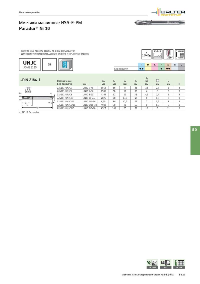 Нарезание резьбы Метчики машинные HSS-E-PM Paradur® Ni 10 – Скруглённый профиль резьбы по внешнему диаметру ≤ C=2-3 49HRC – Для обработки материалов, дающих сливную и сегментную стружку 1,5×DN 1600 10° –1000 N/mm² UNJC 3B P M K N S H O ASME B1.15 Без покрытия CC C CC ~DIN 2184-1 d1 Обозначение DN l1 Lc l3 h9 l9 Без покрытия DN-P мм мм мм мм мм мм мм N P 224101-UNJC4 UNJC 4-40 2,845 56 8 35 3,5 2,7 6 3 DN 224101-UNJC6 UNJC 6-32 3,505 56 10 35 4 3 6 3 224101-UNJC8 UNJC 8-32 4,166 63 11 42 4,5 3,4 6 3 d1 224101-UNJC10 UNJC 10-24 4,826 70 13,5 47 6 4,9 8 3 Lc l9 224101-UNJC1/4 UNJC 1/4-20 6,35 80 17,5 57 7 5,5 8 3 l3 224101-UNJC5/16 UNJC 5/16-18 7,938 90 21 66 8 6,2 9 3 l1 224101-UNJC3/8 UNJC 3/8-16 9,525 100 25 72 10 8 11 3 ≤ UNC 10: без шейки B5 B 1008 D1 B 709 Метчики из быстрорежущей стали HSS-E (-PM) B 921