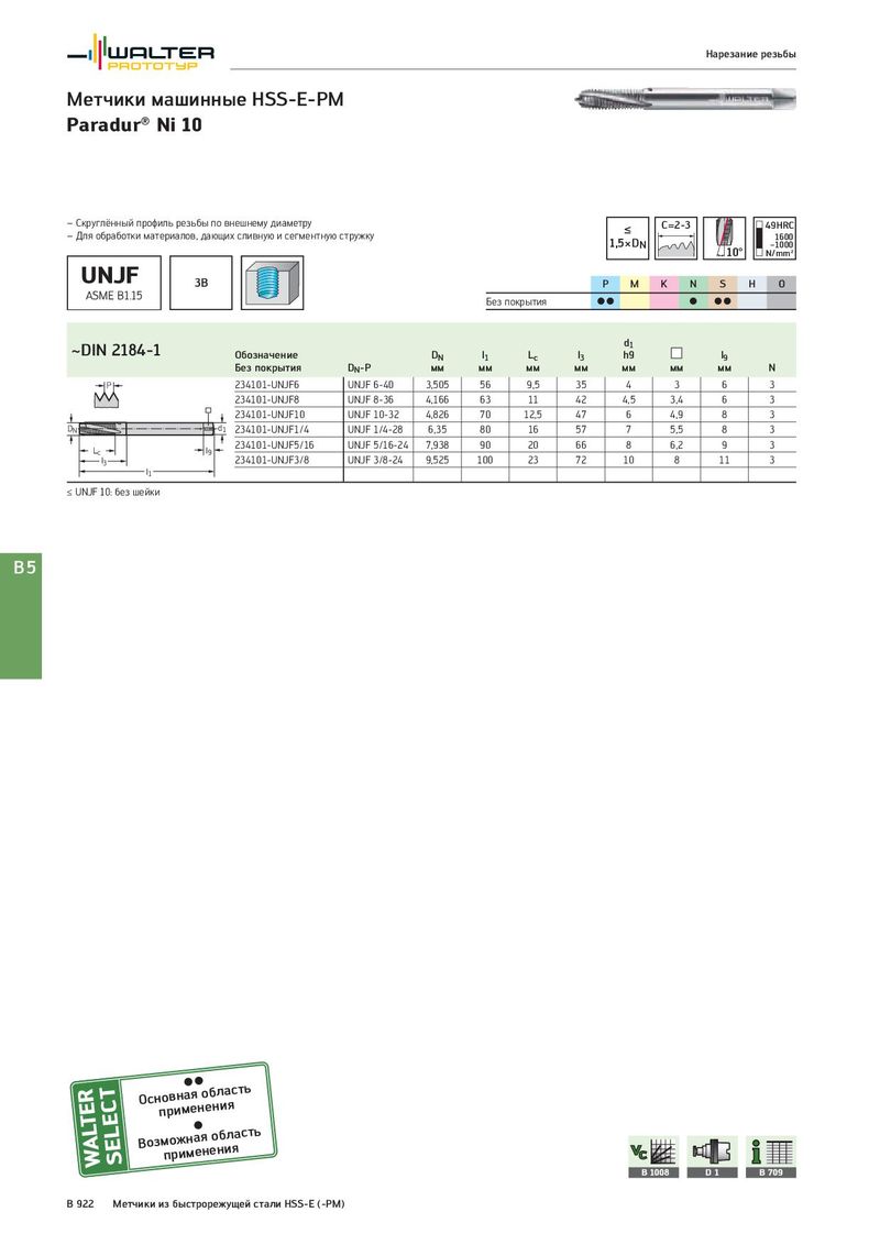 Нарезание резьбы Метчики машинные HSS-E-PM Paradur® Ni 10 – Скруглённый профиль резьбы по внешнему диаметру ≤ C=2-3 49HRC – Для обработки материалов, дающих сливную и сегментную стружку 1,5×DN 1600 10° –1000 N/mm² UNJF 3B P M K N S H O ASME B1.15 Без покрытия CC C CC ~DIN 2184-1 d1 Обозначение DN l1 Lc l3 h9 l9 Без покрытия DN-P мм мм мм мм мм мм мм N P 234101-UNJF6 UNJF 6-40 3,505 56 9,5 35 4 3 6 3 234101-UNJF8 UNJF 8-36 4,166 63 11 42 4,5 3,4 6 3 234101-UNJF10 UNJF 10-32 4,826 70 12,5 47 6 4,9 8 3 DN d1 234101-UNJF1/4 UNJF 1/4-28 6,35 80 16 57 7 5,5 8 3 Lc l9 234101-UNJF5/16 UNJF 5/16-24 7,938 90 20 66 8 6,2 9 3 l3 234101-UNJF3/8 UNJF 3/8-24 9,525 100 23 72 10 8 11 3 l1 ≤ UNJF 10: без шейки B5 Оснпорвинмаеяноебнлиаясть Возмпоржимнаеянеонбиляасть B 1008 D1 B 709 B 922 Метчики из быстрорежущей стали HSS-E (-PM)