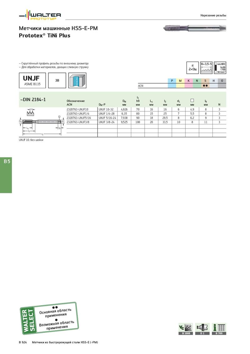 Нарезание резьбы Метчики машинные HSS-E-PM Prototex® TiNi Plus – Скруглённый профиль резьбы по внешнему диаметру ≤ B=3,5-5 44HRC – Для обработки материалов, дающих сливную стружку 2×DN 1400 –700 N/mm² UNJF 3B P M K N S H O ASME B1.15 ACN CC ~DIN 2184-1 l1 Обозначение DN h9 Lc l3 d1 l9 ACN DN-P мм мм мм мм мм мм мм N P 2320763-UNJF10 UNJF 10-32 4,826 70 16 16 6 4,9 8 3 2320763-UNJF1/4 UNJF 1/4-28 6,35 80 15 25 7 5,5 8 3 2320763-UNJF5/16 UNJF 5/16-24 7,938 90 18 29,5 8 6,2 9 3 DN d1 2320763-UNJF3/8 UNJF 3/8-24 9,525 100 20 33,5 10 8 11 3 Lc l9 l3 l1 UNJF 10: без шейки B5 Оснпорвинмаеяноебнлиаясть Возмпоржимнаеянеонбиляасть B 1008 D1 B 709 B 924 Метчики из быстрорежущей стали HSS-E (-PM)