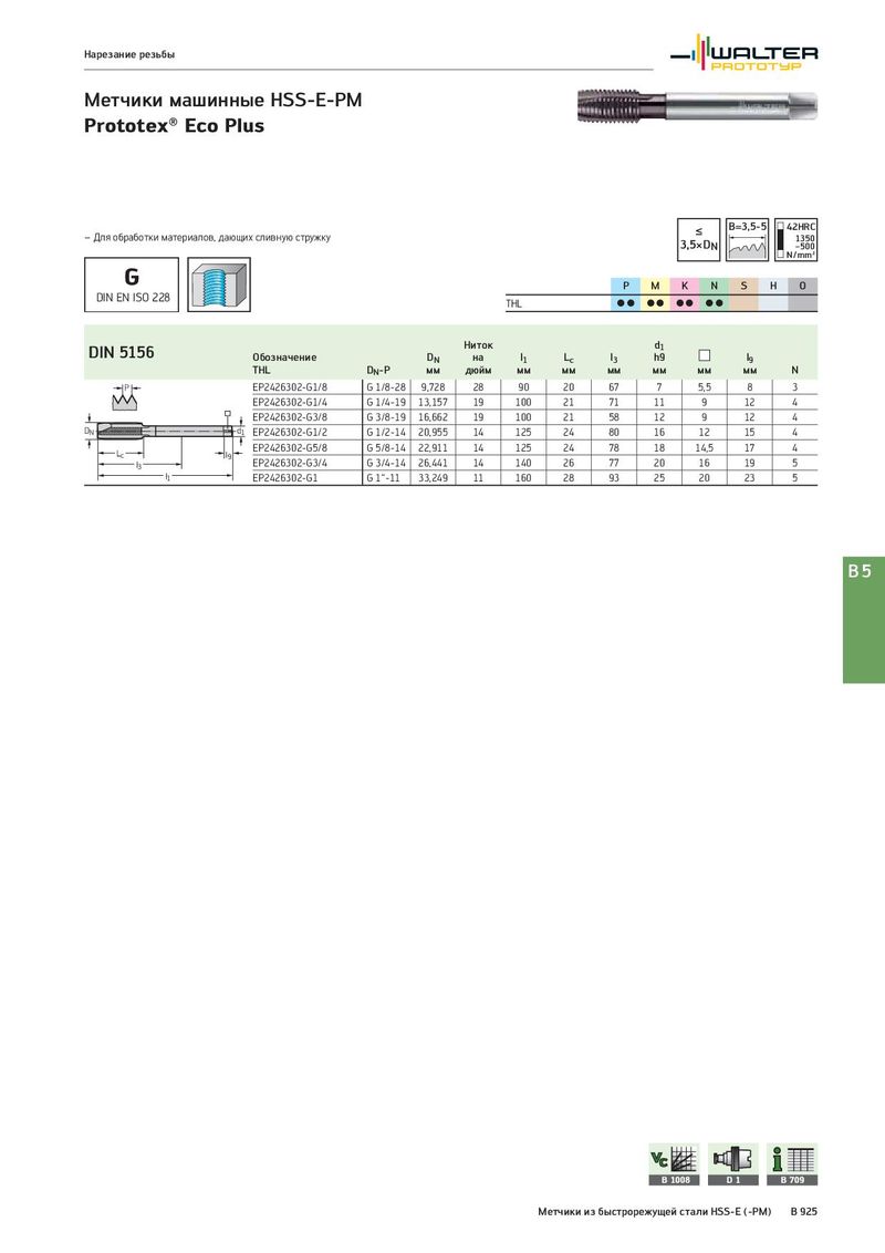 Нарезание резьбы Метчики машинные HSS-E-PM Prototex® Eco Plus ≤ B=3,5-5 42HRC – Для обработки материалов, дающих сливную стружку 3,5×DN 1350 –500 N/mm² G P M K N S H O DIN EN ISO 228 THL CC CC CC CC DIN 5156 Ниток d1 Обозначение DN на l1 Lc l3 h9 l9 THL DN-P мм дюйм мм мм мм мм мм мм N P EP2426302-G1/8 G 1/8-28 9,728 28 90 20 67 7 5,5 8 3 EP2426302-G1/4 G 1/4-19 13,157 19 100 21 71 11 9 12 4 EP2426302-G3/8 G 3/8-19 16,662 19 100 21 58 12 9 12 4 DN d1 EP2426302-G1/2 G 1/2-14 20,955 14 125 24 80 16 12 15 4 Lc l9 EP2426302-G5/8 G 5/8-14 22,911 14 125 24 78 18 14,5 17 4 l3 EP2426302-G3/4 G 3/4-14 26,441 14 140 26 77 20 16 19 5 l1 EP2426302-G1 G 1“-11 33,249 11 160 28 93 25 20 23 5 B5 B 1008 D1 B 709 Метчики из быстрорежущей стали HSS-E (-PM) B 925