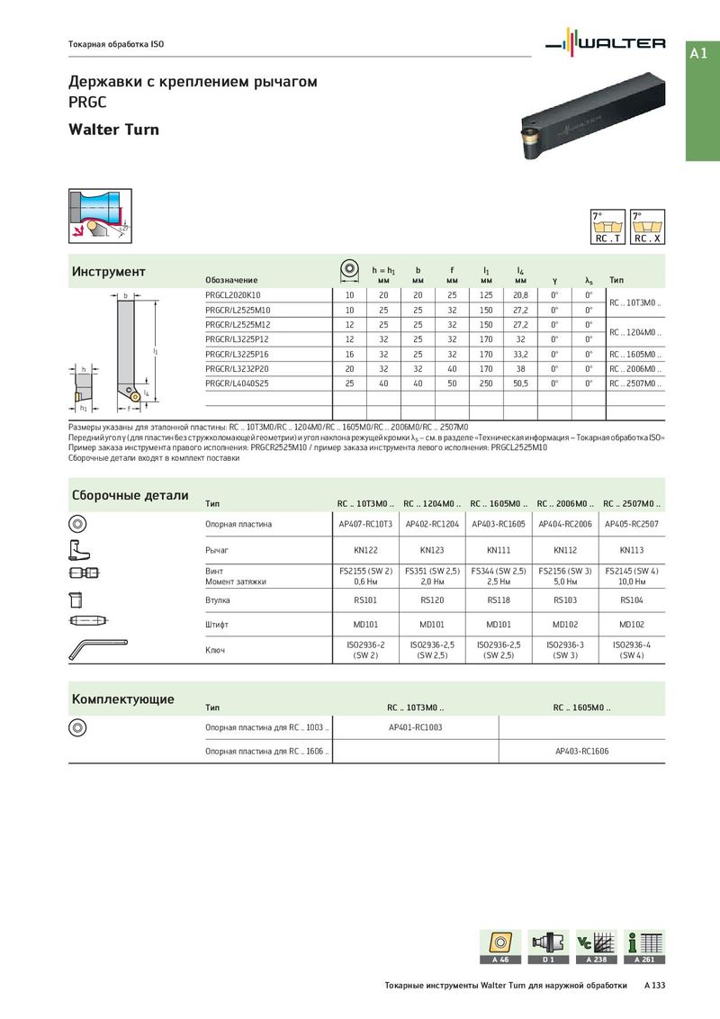 Токарная обработка ISO A1 Державки с креплением рычагом PRGC Walter Turn 7° 7° ≤27° RC . T RC . X Инструмент h = h1 b f l1 l4 Обозначение мм мм мм мм мм γ λs Тип b PRGCL2020K10 10 20 20 25 125 20,8 0° 0° RC .. 10T3M0 .. PRGCR/L2525M10 10 25 25 32 150 27,2 0° 0° PRGCR/L2525M12 12 25 25 32 150 27,2 0° 0° RC .. 1204M0 .. PRGCR/L3225P12 12 32 25 32 170 32 0° 0° l1 PRGCR/L3225P16 16 32 25 32 170 33,2 0° 0° RC .. 1605M0 .. h PRGCR/L3232P20 20 32 32 40 170 38 0° 0° RC .. 2006M0 .. PRGCR/L4040S25 25 40 40 50 250 50,5 0° 0° RC .. 2507M0 .. l4 h1 f Размеры указаны для эталонной пластины: RC .. 10T3M0/RC .. 1204M0/RC .. 1605M0/RC .. 2006M0/RC .. 2507M0 Передний угол γ (для пластин без стружколомающей геометрии) и угол наклона режущей кромки λs − см. в разделе «Техническая информация – Токарная обработка ISO» Пример заказа инструмента правого исполнения: PRGCR2525M10 / пример заказа инструмента левого исполнения: PRGCL2525M10 Сборочные детали входят в комплект поставки Сборочные детали Тип RC .. 10T3M0 .. RC .. 1204M0 .. RC .. 1605M0 .. RC .. 2006M0 .. RC .. 2507M0 .. Опорная пластина AP407-RC10T3 AP402-RC1204 AP403-RC1605 AP404-RC2006 AP405-RC2507 Рычаг KN122 KN123 KN111 KN112 KN113 Винт FS2155 (SW 2) FS351 (SW 2,5) FS344 (SW 2,5) FS2156 (SW 3) FS2145 (SW 4) Момент затяжки 0,6 Нм 2,0 Нм 2,5 Нм 5,0 Нм 10,0 Нм Втулка RS101 RS120 RS118 RS103 RS104 Штифт MD101 MD101 MD101 MD102 MD102 Ключ ISO2936-2 ISO2936-2,5 ISO2936-2,5 ISO2936-3 ISO2936-4 (SW 2) (SW 2,5) (SW 2,5) (SW 3) (SW 4) Комплектующие Тип RC .. 10T3M0 .. RC .. 1605M0 .. Опорная пластина для RC .. 1003 .. AP401-RC1003 Опорная пластина для RC .. 1606 .. AP403-RC1606 A 46 D1 A 238 A 261 Токарные инструменты Walter Turn для наружной обработки A 133