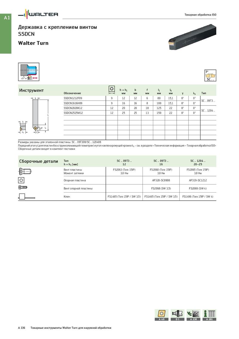 A1 Токарная обработка ISO Державка с креплением винтом SSDCN Walter Turn 7° 45° SC . . Инструмент h = h1 b f l1 l4 Обозначение мм мм мм мм мм γ λs Тип b SSDCN1212F09 9 12 12 6 80 15,1 0° 0° SC .. 09T3 .. SSDCN1616H09 9 16 16 8 100 15,1 0° 0° SSDCN2020K12 12 20 20 10 125 22 0° 0° SC .. 1204 .. l1 SSDCN2525M12 12 25 25 13 150 22 0° 0° h 45˚ l4 h1 f Размеры указаны для эталонной пластины: SC .. 09T308/SC .. 120408 Передний угол γ (для пластин без стружколомающей геометрии) и угол наклона режущей кромки λs − см. в разделе «Техническая информация – Токарная обработка ISO» Сборочные детали входят в комплект поставки Сборочные детали Тип SC .. 09T3 .. SC .. 09T3 .. SC .. 1204 .. h = h1 [мм] 12 16 20–25 Винт пластины FS2063 (Torx 15IP) FS2060 (Torx 15IP) FS2065 (Torx 15IP) Момент затяжки 3,0 Нм 3,0 Нм 3,0 Нм Опорная пластина AP328-SC0908 AP319-SC1212 Винт опорной пластины FS2068 (SW 3,5) FS2069 (SW 4) Ключ FS1465 (Torx 15IP / SW 3,5) FS1465 (Torx 15IP / SW 3,5) FS1496 (Torx 15IP / SW 4) A 48 D1 A 238 A 261 A 136 Токарные инструменты Walter Turn для наружной обработки