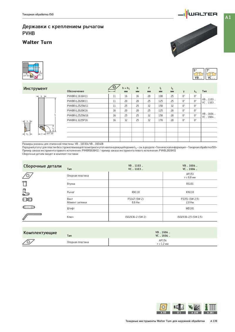 Токарная обработка ISO A1 Державки с креплением рычагом PVHB Walter Turn 5° 7° ≤35° 107°30‘ VB . . VC . . Инструмент h = h1 b f l1 l4 Обозначение мм мм мм мм мм γ λs Тип b PVHBR/L1616H11 11 16 16 20 100 25 0° 0° PVHBR/L2020K11 11 20 20 25 125 25 0° 0° VB .. 1103 .. VC .. 1103 .. PVHBR/L2525M11 11 25 25 32 150 32 0° 0° PVHBR/L2020K16 16 20 20 25 125 28 0° 0° l1 PVHBR/L2525M16 16 25 25 32 150 28 0° 0° VB .. 1604 .. VC .. 1604 .. h PVHBR/L3225P16 16 32 25 32 170 28 0° 0° l4 h1 f 107˚30' Размеры указаны для эталонной пластины: VB .. 110304/VB .. 160408 Передний угол γ (для пластин без стружколомающей геометрии) и угол наклона режущей кромки λs − см. в разделе «Техническая информация – Токарная обработка ISO» Пример заказа инструмента правого исполнения: PVHBR1616H11 / пример заказа инструмента левого исполнения: PVHBL1616H11 Сборочные детали входят в комплект поставки Сборочные детали VB .. 1103 .. VB .. 1604 .. Тип VC .. 1103 .. VC .. 1604 .. Опорная пластина AP153 r ≤ 0,8 мм Втулка RS101 Рычаг KN118 KN110 Винт FS347 (SW 2) FS351 (SW 2,5) Момент затяжки 0,6 Нм 2,0 Нм Штифт MD101 Ключ ISO2936-2 (SW 2) ISO2936-2,5 (SW 2,5) Комплектующие VB .. 1604 .. Тип VC .. 1604 .. Опорная пластина AP154 r ≤ 1,2 мм A 55 D1 A 238 A 261 Токарные инструменты Walter Turn для наружной обработки A 139