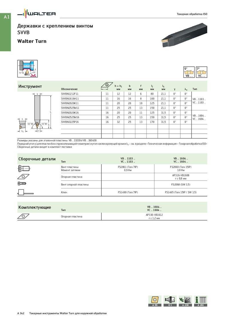 A1 Токарная обработка ISO Державки с креплением винтом SVVB Walter Turn 5° 7° 72°30‘ ≤70° VB . . VC . . Инструмент h = h1 b f l1 l4 Обозначение мм мм мм мм мм γ λs Тип b SVVBN1212F11 11 12 12 6 80 21,1 0° 0° SVVBN1616H11 11 16 16 8 100 21,1 0° 0° VB .. 1103 .. SVVBN2020K11 11 20 20 10 125 21,1 0° 0° VC .. 1103 .. SVVBN2525M11 11 25 25 13 150 21,1 0° 0° l1 SVVBN2020K16 16 20 20 11 125 31,5 0° 0° SVVBN2525M16 16 25 25 13 150 31,5 0° 0° VB .. 1604 .. h VC .. 1604 .. 72˚30' 72˚30' l4 SVVBN3225P16 16 32 25 13 170 31,5 0° 0° h1 f Размеры указаны для эталонной пластины: VB .. 110304/VB .. 160408 Передний угол γ (для пластин без стружколомающей геометрии) и угол наклона режущей кромки λs − см. в разделе «Техническая информация – Токарная обработка ISO» Сборочные детали входят в комплект поставки Сборочные детали VB .. 1103 .. VB .. 1604 .. Тип VC .. 1103 .. VC .. 1604 .. Винт пластины FS2061 (Torx 7IP) FS2060 (Torx 15IP) Момент затяжки 0,9 Нм 3,0 Нм Опорная пластина AP316-VB1608 r ≤ 0,8 мм Винт опорной пластины FS2068 (SW 3,5) Ключ FS1490 (Torx 7IP) FS1465 (Torx 15IP / SW 3,5) Комплектующие VB .. 1604 .. Тип VC .. 1604 .. Опорная пластина AP330-VB1612 r ≤ 1,2 мм A 55 D1 A 238 A 261 A 142 Токарные инструменты Walter Turn для наружной обработки