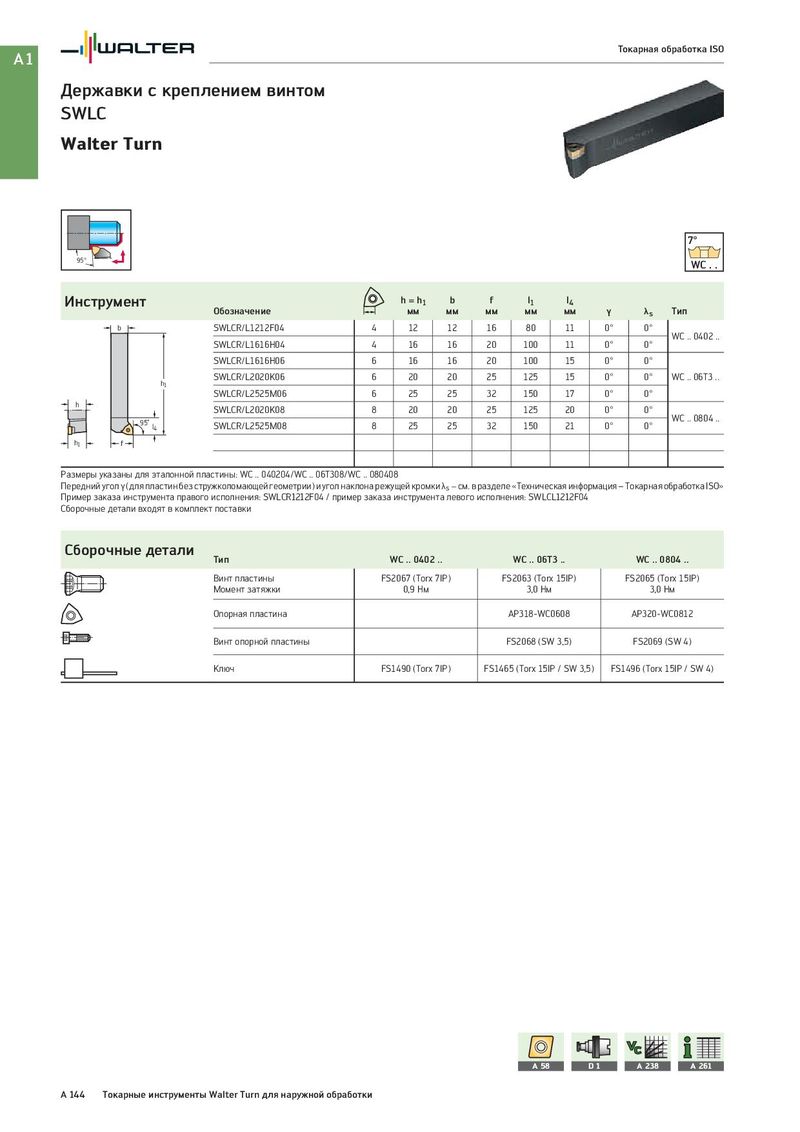 A1 Токарная обработка ISO Державки с креплением винтом SWLC Walter Turn 7° 95° WC . . Инструмент h = h1 b f l1 l4 Обозначение мм мм мм мм мм γ λs Тип b SWLCR/L1212F04 4 12 12 16 80 11 0° 0° WC .. 0402 .. SWLCR/L1616H04 4 16 16 20 100 11 0° 0° SWLCR/L1616H06 6 16 16 20 100 15 0° 0° h1 SWLCR/L2020K06 6 20 20 25 125 15 0° 0° WC .. 06T3 .. SWLCR/L2525M06 6 25 25 32 150 17 0° 0° h SWLCR/L2020K08 8 20 20 25 125 20 0° 0° 95˚ WC .. 0804 .. l4 SWLCR/L2525M08 8 25 25 32 150 21 0° 0° h1 f Размеры указаны для эталонной пластины: WC .. 040204/WC .. 06T308/WC .. 080408 Передний угол γ (для пластин без стружколомающей геометрии) и угол наклона режущей кромки λs − см. в разделе «Техническая информация – Токарная обработка ISO» Пример заказа инструмента правого исполнения: SWLCR1212F04 / пример заказа инструмента левого исполнения: SWLCL1212F04 Сборочные детали входят в комплект поставки Сборочные детали Тип WC .. 0402 .. WC .. 06T3 .. WC .. 0804 .. Винт пластины FS2067 (Torx 7IP) FS2063 (Torx 15IP) FS2065 (Torx 15IP) Момент затяжки 0,9 Нм 3,0 Нм 3,0 Нм Опорная пластина AP318-WC0608 AP320-WC0812 Винт опорной пластины FS2068 (SW 3,5) FS2069 (SW 4) Ключ FS1490 (Torx 7IP) FS1465 (Torx 15IP / SW 3,5) FS1496 (Torx 15IP / SW 4) A 58 D1 A 238 A 261 A 144 Токарные инструменты Walter Turn для наружной обработки