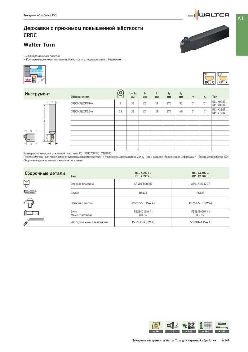 Токарная обработка ISO A1 Державки с прижимом повышенной жёсткости CRDC Walter Turn – Для керамических пластин – Крепление прижимом повышенной жёсткости с твердосплавным башмаком 7° 11° 90° RC . X RP . X Инструмент h = h1 b f l1 l4 Обозначение мм мм мм мм мм γ λs Тип b CRDCN3225P09-A 9 32 25 17 170 31 0° 0° RC . X0907 .. RP . X0907 .. CRDCN3225P12-A 12 32 25 19 170 40 0° 0° RC . X1207 .. RP . X1207 .. l1 h l4 h1 f Размеры указаны для эталонной пластины: RC . X090700/RC . X120700 Передний угол γ (для пластин без стружколомающей геометрии) и угол наклона режущей кромки λs − см. в разделе «Техническая информация – Токарная обработка ISO» Сборочные детали входят в комплект поставки Сборочные детали RC . X0907 .. RC . X1207 .. Тип RP . X0907 .. RP . X1207 .. Опорная пластина AP416-RC0907 AP417-RC1207 Втулка RS121 RS122 Прижим с винтом PK257-SET (SW 4) PK257-SET (SW 4) Винт FS2240 (SW 4) FS2240 (SW 4) Момент затяжки 8,0 Нм 8,0 Нм Изогнутый ключ для прижима ISO2936-4 (SW 4) ISO2936-4 (SW 4) A 76 D1 A 242 A 261 A 262 Токарные инструменты Walter Turn для наружной обработки A 147