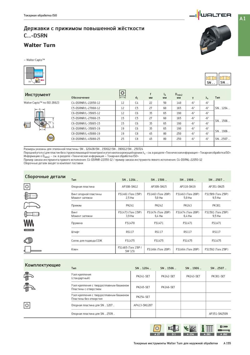 Токарная обработка ISO A1 Державки с прижимом повышенной жёсткости C...-DSRN Walter Turn – Walter Capto™ 75° SN . . SN . . Инструмент f l4 Dmin2 Обозначение d1 мм мм мм γ λs Тип Walter Capto™ по ISO 26623 C4-DSRNR/L-22050-12 12 C4 22 50 140 -6° -6° d1 C5-DSRNR/L-27060-12 12 C5 27 60 165 -6° -6° SN .. 1204 .. C6-DSRNR/L-35065-12 12 C6 35 65 190 -6° -6° C5-DSRNR/L-27060-15 15 C5 27 60 165 -6° -6° 75˚ l4 SN .. 1506 .. C6-DSRNR/L-35065-15 15 C6 35 65 190 -6° -6° f C6-DSRNR/L-35065-19 19 C6 35 65 190 -6° -6° SN .. 1906 .. C8-DSRNR/L-45080-19 19 C8 45 80 250 -6° -6° C8-DSRNR/L-45080-25 25 C8 45 80 250 -6° -6° SN .. 2507 .. Размеры указаны для эталонной пластины: SN .. 120408/SN .. 150612/SN .. 190612/SN .. 250724 Передний угол γ (для пластин без стружколомающей геометрии) и угол наклона режущей кромки λs − см. в разделе «Техническая информация – Токарная обработка ISO» Информацию о Dмин2 − см. в разделе «Техническая информация – Токарная обработка ISO» Пример заказа инструмента правого исполнения: C4-DSRNR-22050-12 / пример заказа инструмента левого исполнения: C4-DSRNL-22050-12 Сборочные детали входят в комплект поставки Сборочные детали Тип SN .. 1204 .. SN .. 1506 .. SN .. 1906 .. SN .. 2507 .. Опорная пластина AP308-SN12 AP309-SN15 AP310-SN19 AP351-SN25 Винт опорной пластины FS1461 (Torx 15IP) FS1463 (Torx 20IP) FS1463 (Torx 20IP) FS1589 (Torx 25IP) Момент затяжки 2,5 Нм 5,0 Нм 5,0 Нм 9,5 Нм Прижим PK241 PK242 PK243 PK301 Винт FS1473 (Torx 15IP) FS1474 (Torx 20IP) FS1474 (Torx 20IP) FS1591 (Torx 25IP) Момент затяжки 3,9 Нм 6,4 Нм 6,4 Нм 9,5 Нм Пружина FS1470 FS1471 FS1471 FS1471 Штифт RS117 RS117 RS117 RS117 Сопло для подвода СОЖ FS1475 FS1475 FS1475 FS1475 Ключ FS1465 (Torx 15IP / FS1464 (Torx 20IP) FS1464 (Torx 20IP) FS1592 (Torx 25IP) SW 3,5) Комплектующие Тип SN .. 1204 .. SN .. 1506 .. SN .. 1906 .. SN .. 2507 .. Узел крепления PK241-SET PK242-SET PK243-SET PK301-SET (стандартный) Узел крепления с твердосплавным башмаком PK245-SET PK246-SET Пластины с отверстием Узел крепления с твердосплавным башмаком PK254-SET Пластины без отверстия Опорная пластина для SN .. 1207 .. AP413-SN1207 Опорная пластина для SN .. 2509 .. AP351-SN2509 A 27 D1 A 234 A 261 A 262 Токарные инструменты Walter Turn для наружной обработки A 155