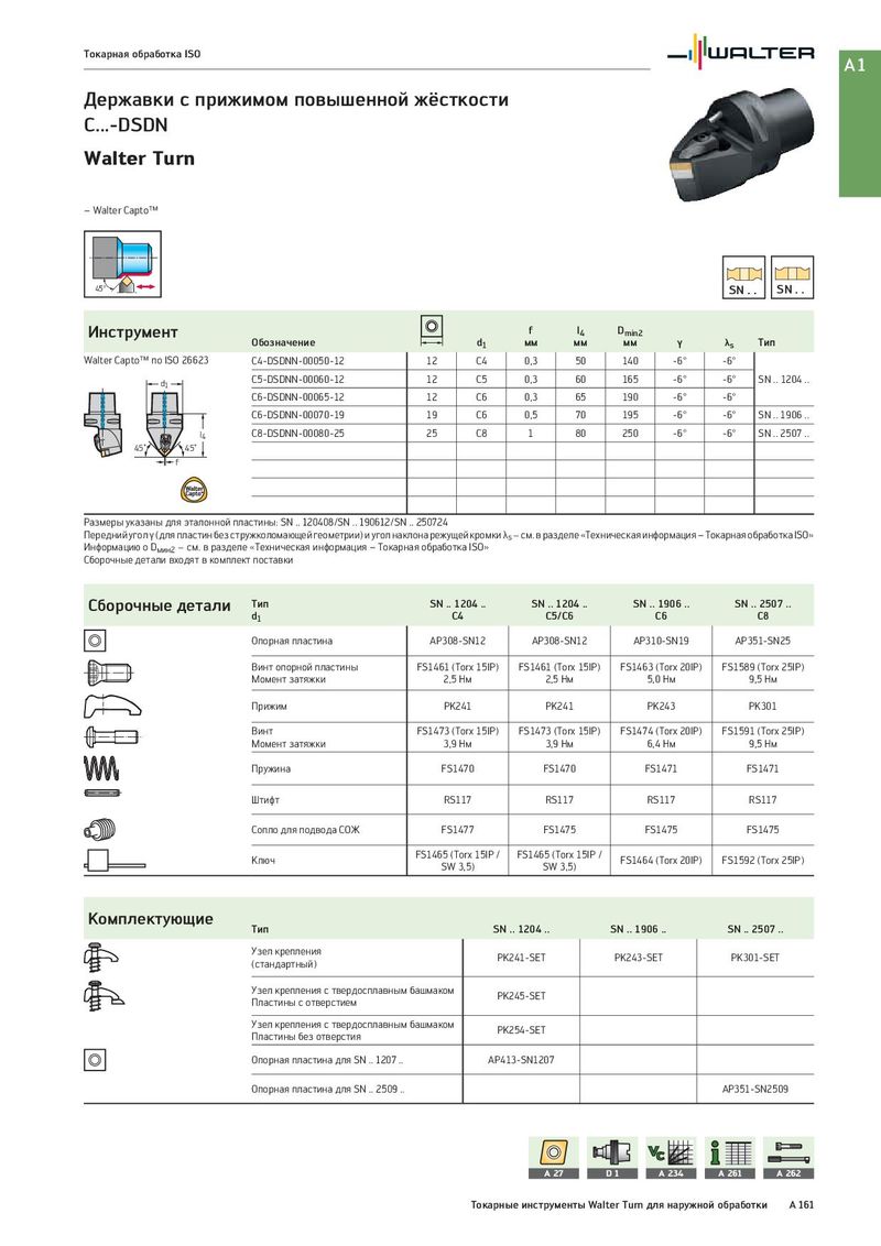 Токарная обработка ISO A1 Державки с прижимом повышенной жёсткости C...-DSDN Walter Turn – Walter Capto™ 45° SN . . SN . . Инструмент f l4 Dmin2 Обозначение d1 мм мм мм γ λs Тип Walter Capto™ по ISO 26623 C4-DSDNN-00050-12 12 C4 0,3 50 140 -6° -6° d1 C5-DSDNN-00060-12 12 C5 0,3 60 165 -6° -6° SN .. 1204 .. C6-DSDNN-00065-12 12 C6 0,3 65 190 -6° -6° C6-DSDNN-00070-19 19 C6 0,5 70 195 -6° -6° SN .. 1906 .. l4 C8-DSDNN-00080-25 25 C8 1 80 250 -6° -6° SN .. 2507 .. 45˚ 45˚ f Размеры указаны для эталонной пластины: SN .. 120408/SN .. 190612/SN .. 250724 Передний угол γ (для пластин без стружколомающей геометрии) и угол наклона режущей кромки λs − см. в разделе «Техническая информация – Токарная обработка ISO» Информацию о Dмин2 − см. в разделе «Техническая информация – Токарная обработка ISO» Сборочные детали входят в комплект поставки Сборочные детали Тип SN .. 1204 .. SN .. 1204 .. SN .. 1906 .. SN .. 2507 .. d1 C4 C5/C6 C6 C8 Опорная пластина AP308-SN12 AP308-SN12 AP310-SN19 AP351-SN25 Винт опорной пластины FS1461 (Torx 15IP) FS1461 (Torx 15IP) FS1463 (Torx 20IP) FS1589 (Torx 25IP) Момент затяжки 2,5 Нм 2,5 Нм 5,0 Нм 9,5 Нм Прижим PK241 PK241 PK243 PK301 Винт FS1473 (Torx 15IP) FS1473 (Torx 15IP) FS1474 (Torx 20IP) FS1591 (Torx 25IP) Момент затяжки 3,9 Нм 3,9 Нм 6,4 Нм 9,5 Нм Пружина FS1470 FS1470 FS1471 FS1471 Штифт RS117 RS117 RS117 RS117 Сопло для подвода СОЖ FS1477 FS1475 FS1475 FS1475 Ключ FS1465 (Torx 15IP / FS1465 (Torx 15IP / FS1464 (Torx 20IP) FS1592 (Torx 25IP) SW 3,5) SW 3,5) Комплектующие Тип SN .. 1204 .. SN .. 1906 .. SN .. 2507 .. Узел крепления PK241-SET PK243-SET PK301-SET (стандартный) Узел крепления с твердосплавным башмаком PK245-SET Пластины с отверстием Узел крепления с твердосплавным башмаком PK254-SET Пластины без отверстия Опорная пластина для SN .. 1207 .. AP413-SN1207 Опорная пластина для SN .. 2509 .. AP351-SN2509 A 27 D1 A 234 A 261 A 262 Токарные инструменты Walter Turn для наружной обработки A 161