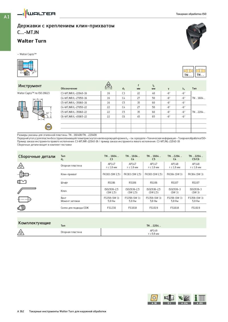 A1 Токарная обработка ISO Державки с креплением клин-прихватом C...-MTJN Walter Turn – Walter Capto™ 93° ≤22° TN . . TN . . Инструмент f l4 Обозначение d1 мм мм γ λs Тип Walter Capto™ по ISO 26623 C3-MTJNR/L-22040-16 16 C3 22 40 -6° -6° d1 C4-MTJNR/L-27050-16 16 C4 27 50 -6° -6° TN .. 1604 .. C5-MTJNR/L-35060-16 16 C5 35 60 -6° -6° C4-MTJNR/L-27050-22 22 C4 27 50 -6° -6° 93˚ l4 C5-MTJNR/L-35060-22 22 C5 35 60 -6° -6° TN .. 2204 .. C6-MTJNR/L-45065-22 22 C6 45 65 -6° -6° f Размеры указаны для эталонной пластины: TN .. 160408/TN .. 220408 Передний угол γ (для пластин без стружколомающей геометрии) и угол наклона режущей кромки λs − см. в разделе «Техническая информация – Токарная обработка ISO» Пример заказа инструмента правого исполнения: C3-MTJNR-22040-16 / пример заказа инструмента левого исполнения: C3-MTJNL-22040-16 Сборочные детали входят в комплект поставки Сборочные детали Тип TN .. 1604 .. TN .. 1604 .. TN .. 1604 .. TN .. 2204 .. TN .. 2204 .. d1 C3 C4 C5 C4 C5/C6 Опорная пластина AP147 AP147 AP147 AP148 AP148 r ≤ 1,6 мм r ≤ 1,6 мм r ≤ 1,6 мм r ≤ 1,6 мм r ≤ 1,6 мм Клин-прихват FK303 (SW 2,5) FK303 (SW 2,5) FK303 (SW 2,5) FK304 (SW 3) FK304 (SW 3) Штифт RS106 RS106 RS106 RS107 RS107 Ключ ISO2936-2,5 ISO2936-2,5 ISO2936-2,5 ISO2936-3 ISO2936-3 (SW 2,5) (SW 2,5) (SW 2,5) (SW 3) (SW 3) Винт FS358 (SW 3) FS358 (SW 3) FS358 (SW 3) FS358 (SW 3) FS358 (SW 3) Момент затяжки 5,0 Нм 5,0 Нм 5,0 Нм 5,0 Нм 5,0 Нм Сопло для подвода СОЖ FS1230 FS1018 FS1019 FS1018 FS1019 Комплектующие Тип TN .. 2204 .. Опорная пластина AP149 r ≤ 0,8 мм A 30 D1 A 234 A 261 A 162 Токарные инструменты Walter Turn для наружной обработки