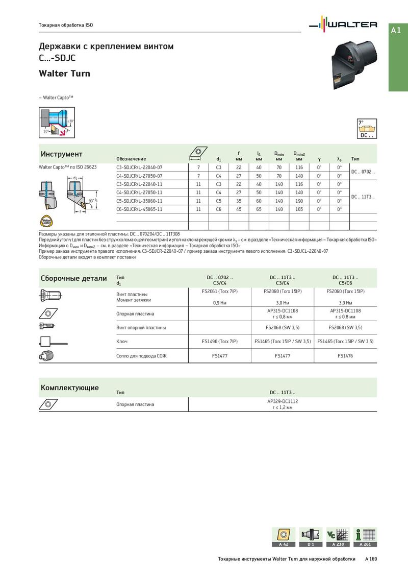Токарная обработка ISO A1 Державки с креплением винтом C...-SDJC Walter Turn – Walter Capto™ ≤30° 7° 93° DC . . Инструмент f l4 Dmin Dmin2 Обозначение d1 мм мм мм мм γ λs Тип Walter Capto™ по ISO 26623 C3-SDJCR/L-22040-07 7 C3 22 40 70 116 0° 0° DC .. 0702 .. d1 C4-SDJCR/L-27050-07 7 C4 27 50 70 140 0° 0° C3-SDJCR/L-22040-11 11 C3 22 40 140 116 0° 0° C4-SDJCR/L-27050-11 11 C4 27 50 140 140 0° 0° 93˚ l4 DC .. 11T3 .. C5-SDJCR/L-35060-11 11 C5 35 60 140 190 0° 0° f C6-SDJCR/L-45065-11 11 C6 45 65 140 165 0° 0° Размеры указаны для эталонной пластины: DC .. 070204/DC .. 11T308 Передний угол γ (для пластин без стружколомающей геометрии) и угол наклона режущей кромки λs − см. в разделе «Техническая информация – Токарная обработка ISO» Информацию о Dмин и Dмин2 − см. в разделе «Техническая информация – Токарная обработка ISO» Пример заказа инструмента правого исполнения: C3-SDJCR-22040-07 / пример заказа инструмента левого исполнения: C3-SDJCL-22040-07 Сборочные детали входят в комплект поставки Сборочные детали Тип DC .. 0702 .. DC .. 11T3 .. DC .. 11T3 .. d1 C3/C4 C3/C4 C5/C6 Винт пластины FS2061 (Torx 7IP) FS2060 (Torx 15IP) FS2060 (Torx 15IP) Момент затяжки 0,9 Нм 3,0 Нм 3,0 Нм Опорная пластина AP315-DC1108 AP315-DC1108 r ≤ 0,8 мм r ≤ 0,8 мм Винт опорной пластины FS2068 (SW 3,5) FS2068 (SW 3,5) Ключ FS1490 (Torx 7IP) FS1465 (Torx 15IP / SW 3,5) FS1465 (Torx 15IP / SW 3,5) Сопло для подвода СОЖ FS1477 FS1477 FS1476 Комплектующие Тип DC .. 11T3 .. Опорная пластина AP329-DC1112 r ≤ 1,2 мм A 42 D1 A 238 A 261 Токарные инструменты Walter Turn для наружной обработки A 169
