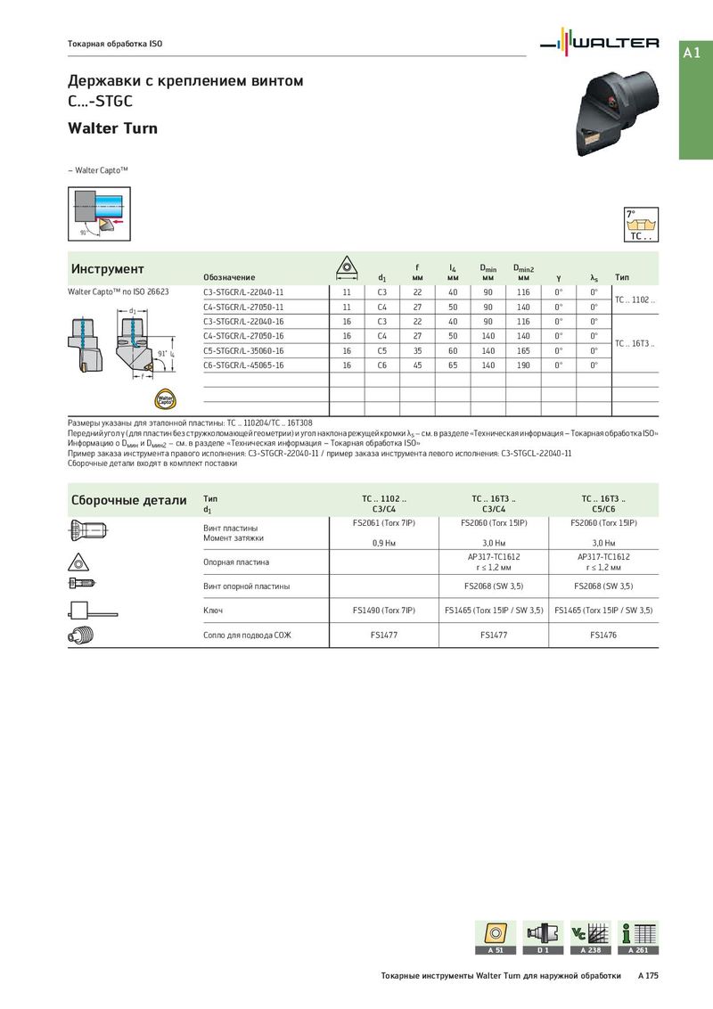 Токарная обработка ISO A1 Державки с креплением винтом C...-STGC Walter Turn – Walter Capto™ 7° 91° TC . . Инструмент f l4 Dmin Dmin2 Обозначение d1 мм мм мм мм γ λs Тип Walter Capto™ по ISO 26623 C3-STGCR/L-22040-11 11 C3 22 40 90 116 0° 0° TC .. 1102 .. d1 C4-STGCR/L-27050-11 11 C4 27 50 90 140 0° 0° C3-STGCR/L-22040-16 16 C3 22 40 90 116 0° 0° C4-STGCR/L-27050-16 16 C4 27 50 140 140 0° 0° TC .. 16T3 .. 91˚ l4 C5-STGCR/L-35060-16 16 C5 35 60 140 165 0° 0° C6-STGCR/L-45065-16 16 C6 45 65 140 190 0° 0° f Размеры указаны для эталонной пластины: TC .. 110204/TC .. 16T308 Передний угол γ (для пластин без стружколомающей геометрии) и угол наклона режущей кромки λs − см. в разделе «Техническая информация – Токарная обработка ISO» Информацию о Dмин и Dмин2 − см. в разделе «Техническая информация – Токарная обработка ISO» Пример заказа инструмента правого исполнения: C3-STGCR-22040-11 / пример заказа инструмента левого исполнения: C3-STGCL-22040-11 Сборочные детали входят в комплект поставки Сборочные детали Тип TC .. 1102 .. TC .. 16T3 .. TC .. 16T3 .. d1 C3/C4 C3/C4 C5/C6 Винт пластины FS2061 (Torx 7IP) FS2060 (Torx 15IP) FS2060 (Torx 15IP) Момент затяжки 0,9 Нм 3,0 Нм 3,0 Нм Опорная пластина AP317-TC1612 AP317-TC1612 r ≤ 1,2 мм r ≤ 1,2 мм Винт опорной пластины FS2068 (SW 3,5) FS2068 (SW 3,5) Ключ FS1490 (Torx 7IP) FS1465 (Torx 15IP / SW 3,5) FS1465 (Torx 15IP / SW 3,5) Сопло для подвода СОЖ FS1477 FS1477 FS1476 A 51 D1 A 238 A 261 Токарные инструменты Walter Turn для наружной обработки A 175