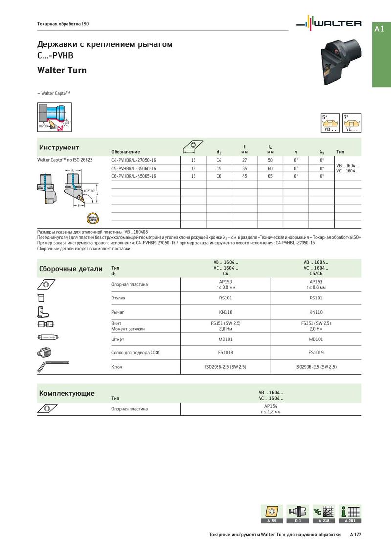Токарная обработка ISO A1 Державки с креплением рычагом C...-PVHB Walter Turn – Walter Capto™ 5° 7° ≤35° 107°30‘ VB . . VC . . Инструмент f l4 Обозначение d1 мм мм γ λs Тип Walter Capto™ по ISO 26623 C4-PVHBR/L-27050-16 16 C4 27 50 0° 0° C5-PVHBR/L-35060-16 16 C5 35 60 0° 0° VB .. 1604 .. d1 VC .. 1604 .. C6-PVHBR/L-45065-16 16 C6 45 65 0° 0° 107˚30' l4 f Размеры указаны для эталонной пластины: VB .. 160408 Передний угол γ (для пластин без стружколомающей геометрии) и угол наклона режущей кромки λs − см. в разделе «Техническая информация – Токарная обработка ISO» Пример заказа инструмента правого исполнения: C4-PVHBR-27050-16 / пример заказа инструмента левого исполнения: C4-PVHBL-27050-16 Сборочные детали входят в комплект поставки VB .. 1604 .. VB .. 1604 .. Сборочные детали Тип VC .. 1604 .. VC .. 1604 .. d1 C4 C5/C6 Опорная пластина AP153 AP153 r ≤ 0,8 мм r ≤ 0,8 мм Втулка RS101 RS101 Рычаг KN110 KN110 Винт FS351 (SW 2,5) FS351 (SW 2,5) Момент затяжки 2,0 Нм 2,0 Нм Штифт MD101 MD101 Сопло для подвода СОЖ FS1018 FS1019 Ключ ISO2936-2,5 (SW 2,5) ISO2936-2,5 (SW 2,5) Комплектующие VB .. 1604 .. Тип VC .. 1604 .. Опорная пластина AP154 r ≤ 1,2 мм A 55 D1 A 238 A 261 Токарные инструменты Walter Turn для наружной обработки A 177