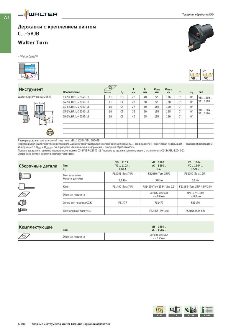 A1 Токарная обработка ISO Державки с креплением винтом C...-SVJB Walter Turn – Walter Capto™ 5° 7° ≤50° 93° VB . . VC . . Инструмент f l4 Dmin Dmin2 Обозначение d1 мм мм мм мм γ λs Тип Walter Capto™ по ISO 26623 C3-SVJBR/L-22040-11 11 C3 22 40 55 116 0° 0° VB .. 1103 .. d1 C4-SVJBR/L-27050-11 11 C4 27 50 55 150 0° 0° VC .. 1103 .. C4-SVJBR/L-27050-16 16 C4 27 50 155 140 0° 0° C5-SVJBR/L-35060-16 16 C5 35 60 155 165 0° 0° VB .. 1604 .. VC .. 1604 .. 93˚ l4 C6-SVJBR/L-45065-16 16 C6 45 65 155 190 0° 0° f Размеры указаны для эталонной пластины: VB .. 110304/VB .. 160408 Передний угол γ (для пластин без стружколомающей геометрии) и угол наклона режущей кромки λs − см. в разделе «Техническая информация – Токарная обработка ISO» Информацию о Dмин и Dмин2 − см. в разделе «Техническая информация – Токарная обработка ISO» Пример заказа инструмента правого исполнения: C3-SVJBR-22040-11 / пример заказа инструмента левого исполнения: C3-SVJBL-22040-11 Сборочные детали входят в комплект поставки VB .. 1103 .. VB .. 1604 .. VB .. 1604 .. Сборочные детали Тип VC .. 1103 .. VC .. 1604 .. VC .. 1604 .. d1 C3/C4 C4 C5/C6 Винт пластины FS2061 (Torx 7IP) FS2060 (Torx 15IP) FS2060 (Torx 15IP) Момент затяжки 0,9 Нм 3,0 Нм 3,0 Нм Ключ FS1490 (Torx 7IP) FS1465 (Torx 15IP / SW 3,5) FS1465 (Torx 15IP / SW 3,5) Опорная пластина AP316-VB1608 AP316-VB1608 r ≤ 0,8 мм r ≤ 0,8 мм Сопло для подвода СОЖ FS1477 FS1477 FS1476 Винт опорной пластины FS2068 (SW 3,5) FS2068 (SW 3,5) Комплектующие VB .. 1604 .. Тип VC .. 1604 .. Опорная пластина AP330-VB1612 r ≤ 1,2 мм A 55 D1 A 238 A 261 A 178 Токарные инструменты Walter Turn для наружной обработки