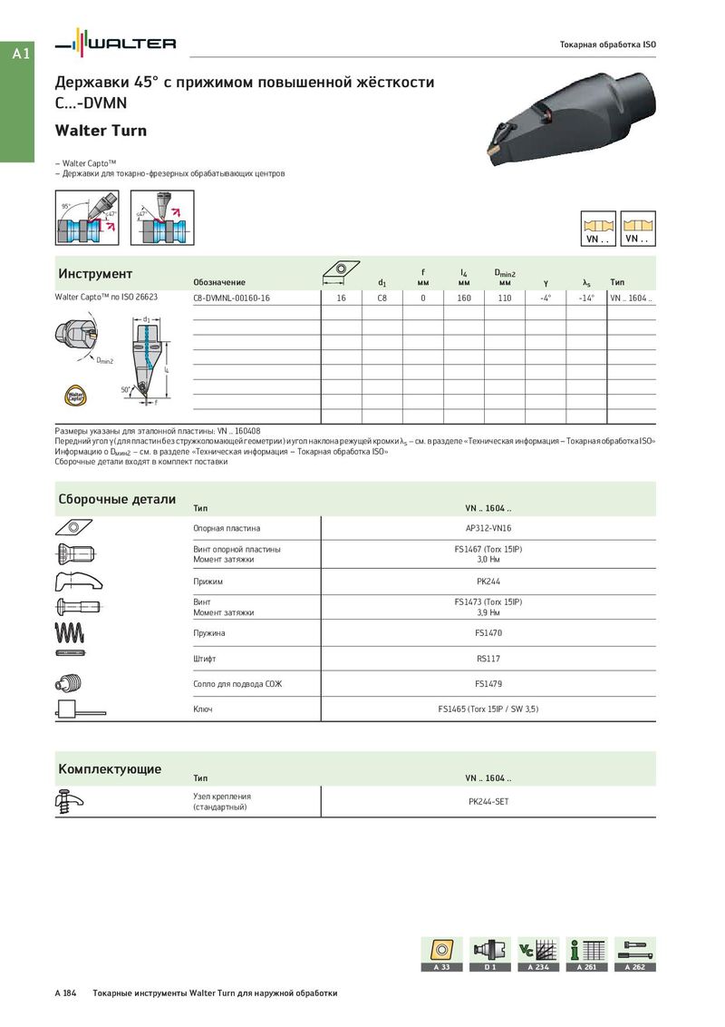 A1 Токарная обработка ISO Державки 45° с прижимом повышенной жёсткости C...-DVMN Walter Turn – Walter Capto™ – Державки для токарно-фрезерных обрабатывающих центров 95° ≤47° ≤47° VN . . VN . . Инструмент f l4 Dmin2 Обозначение d1 мм мм мм γ λs Тип Walter Capto™ по ISO 26623 C8-DVMNL-00160-16 16 C8 0 160 110 -4° -14° VN .. 1604 .. d1 Dmin2 l4 50˚ f Размеры указаны для эталонной пластины: VN .. 160408 Передний угол γ (для пластин без стружколомающей геометрии) и угол наклона режущей кромки λs − см. в разделе «Техническая информация – Токарная обработка ISO» Информацию о Dмин2 − см. в разделе «Техническая информация – Токарная обработка ISO» Сборочные детали входят в комплект поставки Сборочные детали Тип VN .. 1604 .. Опорная пластина AP312-VN16 Винт опорной пластины FS1467 (Torx 15IP) Момент затяжки 3,0 Нм Прижим PK244 Винт FS1473 (Torx 15IP) Момент затяжки 3,9 Нм Пружина FS1470 Штифт RS117 Сопло для подвода СОЖ FS1479 Ключ FS1465 (Torx 15IP / SW 3,5) Комплектующие Тип VN .. 1604 .. Узел крепления PK244-SET (стандартный) A 33 D1 A 234 A 261 A 262 A 184 Токарные инструменты Walter Turn для наружной обработки