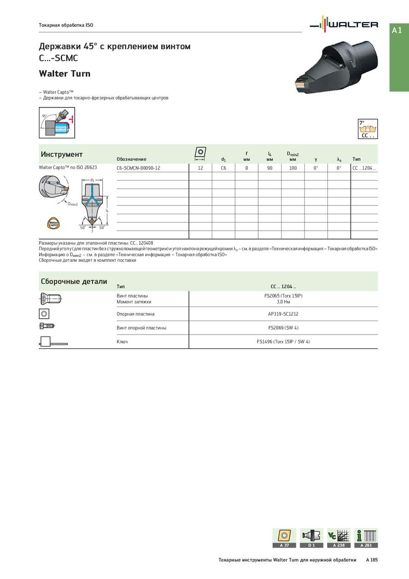 Токарная обработка ISO A1 Державки 45° с креплением винтом C...-SCMC Walter Turn – Walter Capto™ – Державки для токарно-фрезерных обрабатывающих центров 95° 7° CC . . Инструмент f l4 Dmin2 Обозначение d1 мм мм мм γ λs Тип Walter Capto™ по ISO 26623 C6-SCMCN-00090-12 12 C6 0 90 100 0° 0° CC .. 1204 .. d1 Dmin2 l4 50˚ f 50˚ Размеры указаны для эталонной пластины: CC.. 120408 Передний угол γ (для пластин без стружколомающей геометрии) и угол наклона режущей кромки λs − см. в разделе «Техническая информация – Токарная обработка ISO» Информацию о Dмин2 − см. в разделе «Техническая информация – Токарная обработка ISO» Сборочные детали входят в комплект поставки Сборочные детали Тип CC .. 1204 .. Винт пластины FS2065 (Torx 15IP) Момент затяжки 3,0 Нм Опорная пластина AP319-SC1212 Винт опорной пластины FS2069 (SW 4) Ключ FS1496 (Torx 15IP / SW 4) A 37 D1 A 238 A 261 Токарные инструменты Walter Turn для наружной обработки A 185