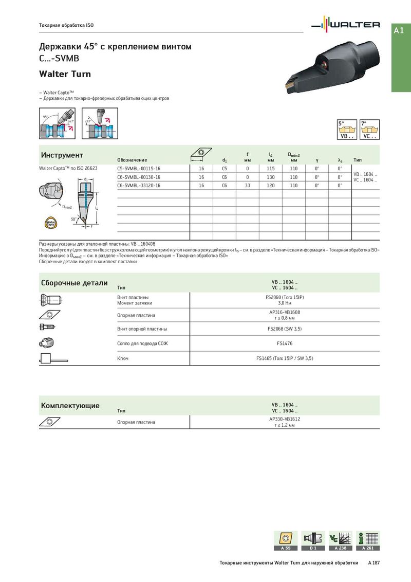 Токарная обработка ISO A1 Державки 45° с креплением винтом C...-SVMB Walter Turn – Walter Capto™ – Державки для токарно-фрезерных обрабатывающих центров 95° ≤47° ≤47° 5° 7° VB . . VC . . Инструмент f l4 Dmin2 Обозначение d1 мм мм мм γ λs Тип Walter Capto™ по ISO 26623 C5-SVMBL-00115-16 16 C5 0 115 110 0° 0° C6-SVMBL-00130-16 16 C6 0 130 110 0° 0° VB .. 1604 .. d1 VC .. 1604 .. C6-SVMBL-33120-16 16 C6 33 120 110 0° 0° Dmin2 l4 50˚ f Размеры указаны для эталонной пластины: VB .. 160408 Передний угол γ (для пластин без стружколомающей геометрии) и угол наклона режущей кромки λs − см. в разделе «Техническая информация – Токарная обработка ISO» Информацию о Dмин2 − см. в разделе «Техническая информация – Токарная обработка ISO» Сборочные детали входят в комплект поставки Сборочные детали VB .. 1604 .. Тип VC .. 1604 .. Винт пластины FS2060 (Torx 15IP) Момент затяжки 3,0 Нм Опорная пластина AP316-VB1608 r ≤ 0,8 мм Винт опорной пластины FS2068 (SW 3,5) Сопло для подвода СОЖ FS1476 Ключ FS1465 (Torx 15IP / SW 3,5) Комплектующие VB .. 1604 .. Тип VC .. 1604 .. Опорная пластина AP330-VB1612 r ≤ 1,2 мм A 55 D1 A 238 A 261 Токарные инструменты Walter Turn для наружной обработки A 187