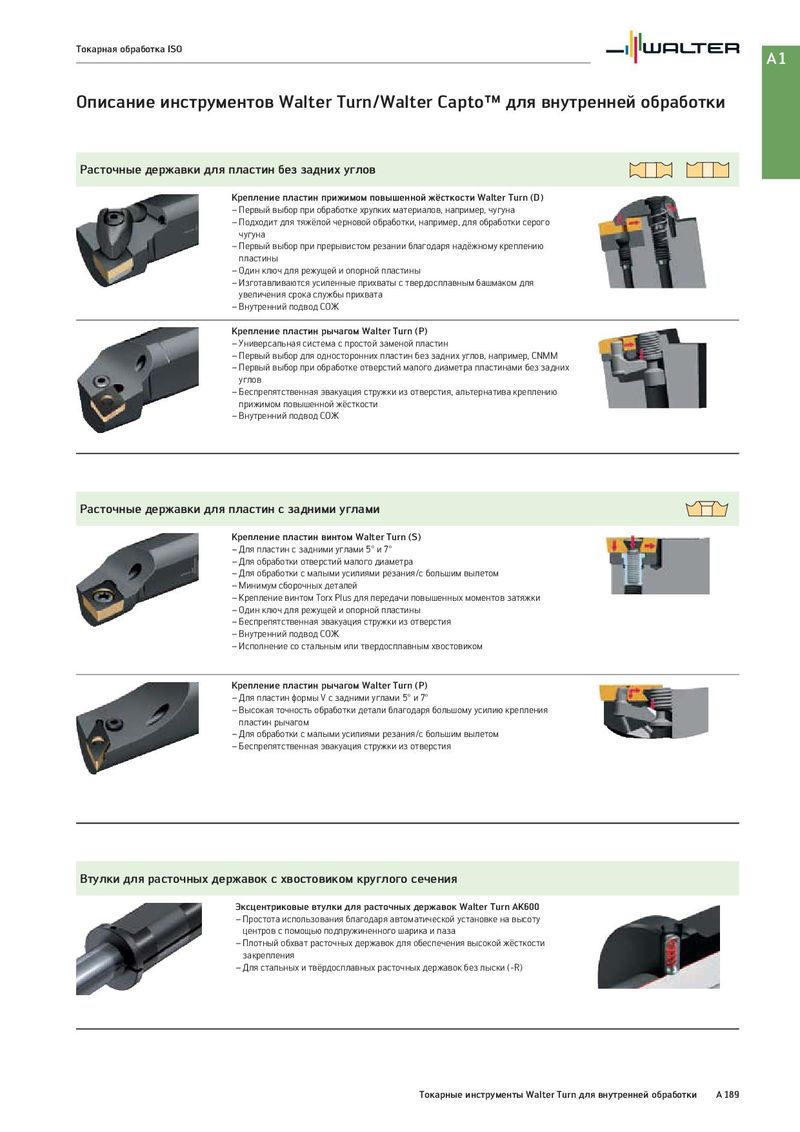 Токарная обработка ISO A1 Описание инструментов Walter Turn/Walter Capto™ для внутренней обработки Расточные державки для пластин без задних углов Крепление пластин прижимом повышенной жёсткости Walter Turn (D) – Первый выбор при обработке хрупких материалов, например, чугуна – Подходит для тяжёлой черновой обработки, например, для обработки серого чугуна – Первый выбор при прерывистом резании благодаря надёжному креплению пластины – Один ключ для режущей и опорной пластины – Изготавливаются усиленные прихваты с твердосплавным башмаком для увеличения срока службы прихвата – Внутренний подвод СОЖ Крепление пластин рычагом Walter Turn (P) – Универсальная система с простой заменой пластин – Первый выбор для односторонних пластин без задних углов, например, CNMM – Первый выбор при обработке отверстий малого диаметра пластинами без задних углов – Беспрепятственная эвакуация стружки из отверстия, альтернатива креплению прижимом повышенной жёсткости – Внутренний подвод СОЖ Расточные державки для пластин с задними углами Крепление пластин винтом Walter Turn (S) – Для пластин с задними углами 5° и 7° – Для обработки отверстий малого диаметра – Для обработки с малыми усилиями резания/с большим вылетом – Минимум сборочных деталей – Крепление винтом Torx Plus для передачи повышенных моментов затяжки – Один ключ для режущей и опорной пластины – Беспрепятственная эвакуация стружки из отверстия – Внутренний подвод СОЖ – Исполнение со стальным или твердосплавным хвостовиком Крепление пластин рычагом Walter Turn (P) – Для пластин формы V с задними углами 5° и 7° – Высокая точность обработки детали благодаря большому усилию крепления пластин рычагом – Для обработки с малыми усилиями резания/с большим вылетом – Беспрепятственная эвакуация стружки из отверстия Втулки для расточных державок с хвостовиком круглого сечения Эксцентриковые втулки для расточных державок Walter Turn AK600 – Простота использования благодаря автоматической установке на высоту центров с помощью подпружиненного шарика и паза – Плотный обхват расточных державок для обеспечения высокой жёсткости закрепления – Для стальных и твёрдосплавных расточных державок без лыски (-R) Токарные инструменты Walter Turn для внутренней обработки A 189