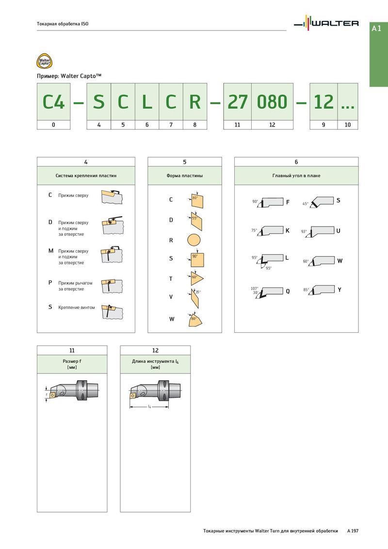Токарная обработка ISO A1 Пример: Walter Capto™ C4 – S C L C R – 27 080 – 12 ... 0 4 5 6 7 8 11 12 9 10 4 5 6 Система крепления пластин Форма пластины Главный угол в плане C Прижим сверху C 80° 90° 45° D D 55° Прижим сверху и поджим 75° 93° за отверстие R M Прижим сверху и поджим S 90° 95° за отверстие 60° 95° T 60° P Прижим рычагом за отверстие 107° 85° 35° 30‘ V S Крепление винтом W 80° 11 12 Размер f Длина инструмента l4 [мм] [мм] f l4 Токарные инструменты Walter Turn для внутренней обработки A 197