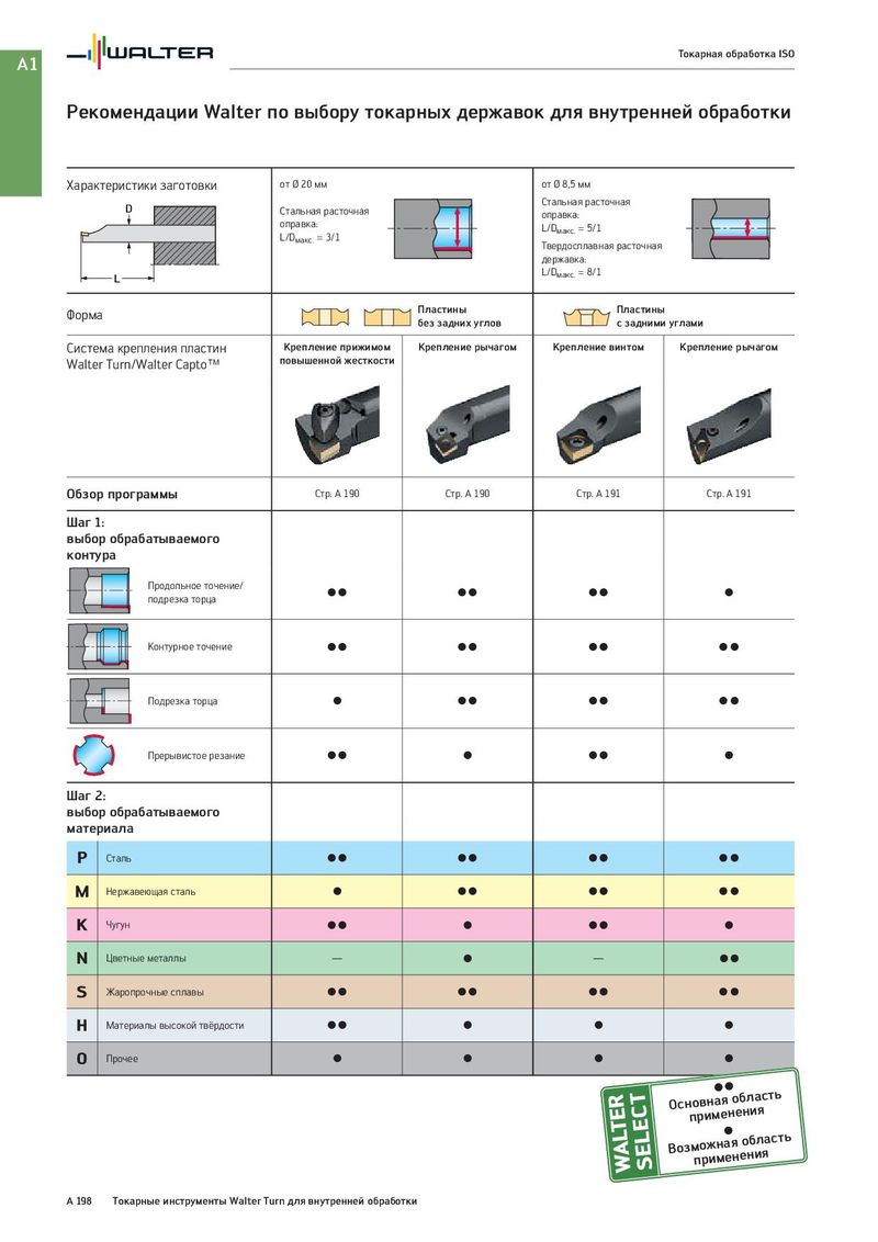 A1 Токарная обработка ISO Рекомендации Walter по выбору токарных державок для внутренней обработки Характеристики заготовки от Ø 20 мм от Ø 8,5 мм D Стальная расточная Стальная расточная оправка: оправка: L/Dмакс. = 5/1 L/Dмакс. = 3/1 Твердосплавная расточная державка: L L/Dмакс. = 8/1 Форма Пластины Пластины без задних углов с задними углами Система крепления пластин Крепление прижимом Крепление рычагом Крепление винтом Крепление рычагом Walter Turn/Walter Capto™ повышенной жесткости Обзор программы Стр. A 190 Стр. A 190 Стр. A 191 Стр. A 191 Шаг 1: выбор обрабатываемого контура Продольное точение/ CC CC CC C подрезка торца Контурное точение CC CC CC CC Подрезка торца C CC CC CC Прерывистое резание CC C CC C Шаг 2: выбор обрабатываемого материала P Сталь CC CC CC CC M Нержавеющая сталь C CC CC CC K Чугун CC C CC C N Цветные металлы — C — CC S Жаропрочные сплавы CC CC CC CC H Материалы высокой твёрдости CC C C C O Прочее C C C C Оснпорвинмаеяноебнлиаясть Возмпоржимнаеянеонбиляасть A 198 Токарные инструменты Walter Turn для внутренней обработки